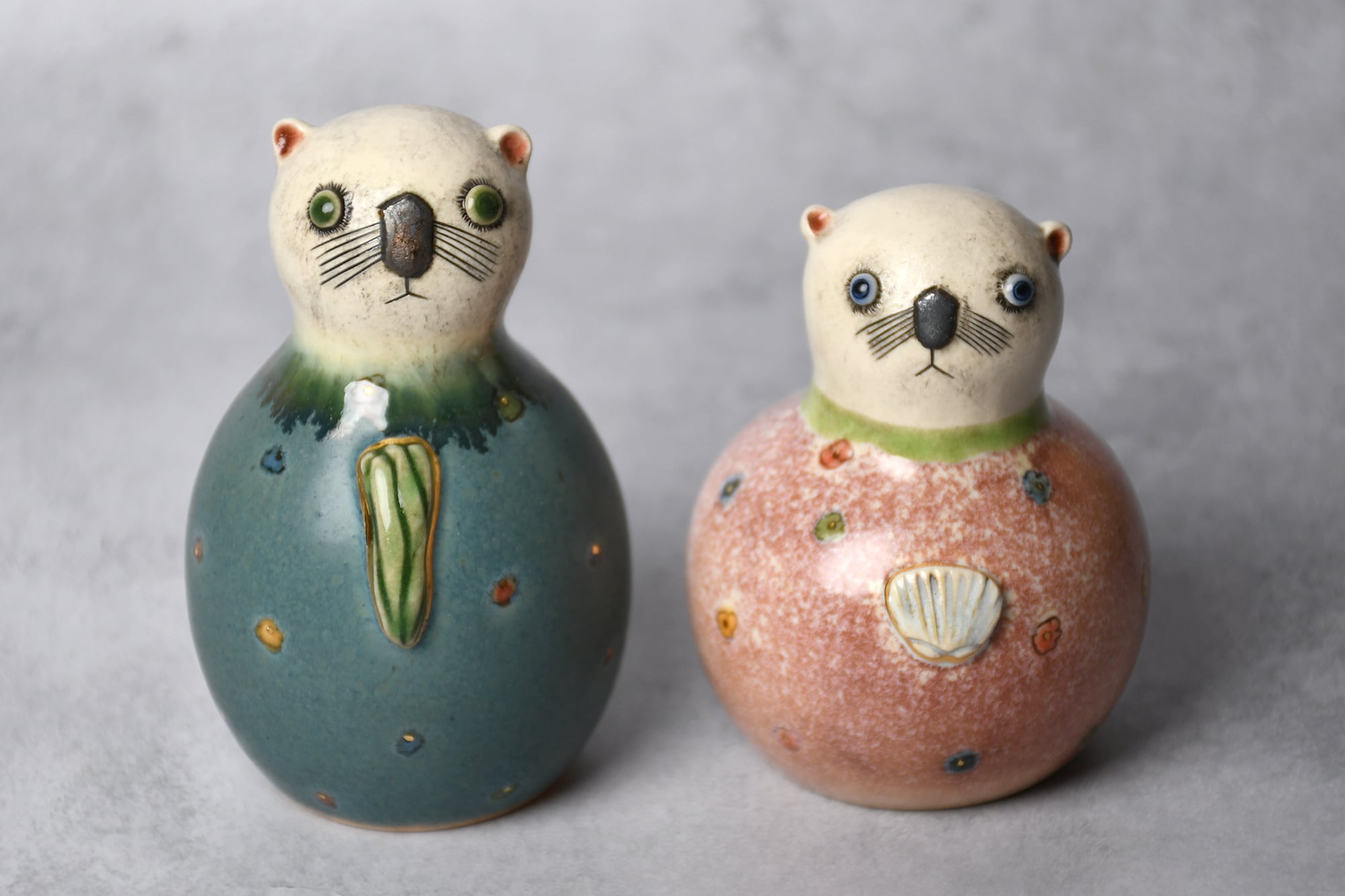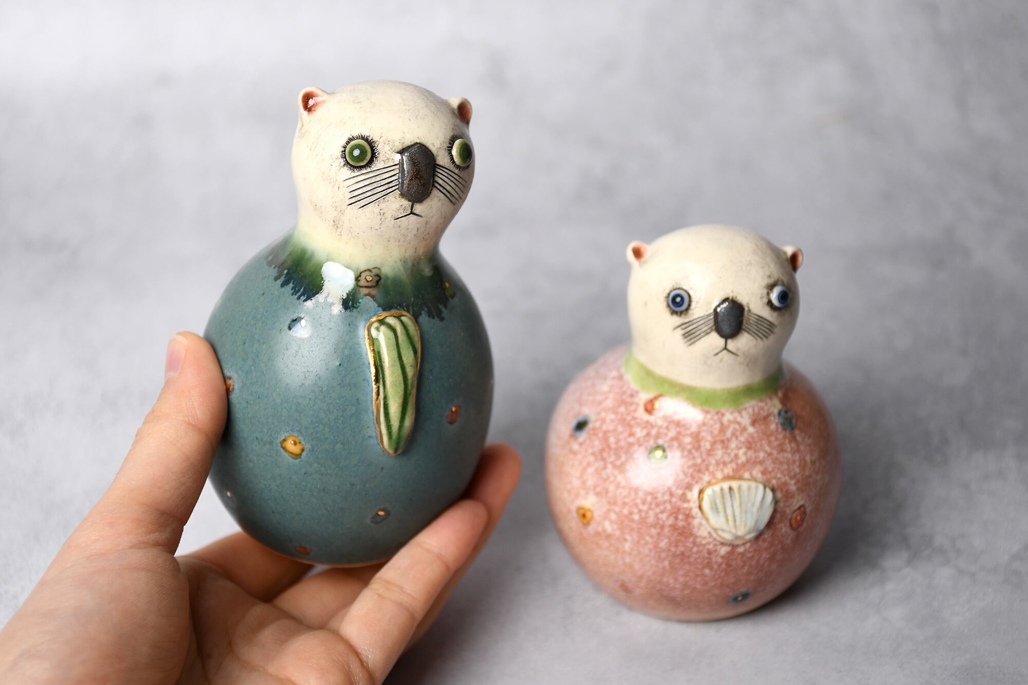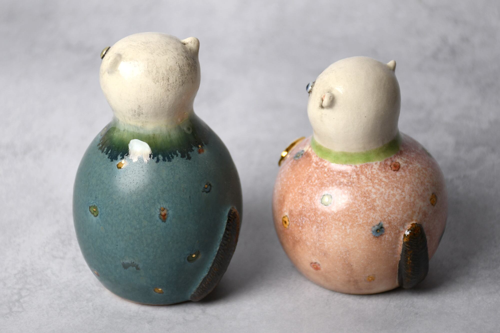 型を使わずにひとつひとつ成形していますので、体格や表情もそれぞれ異なる1点ものです。どうぞお気に入りのふたりを見つけてください。