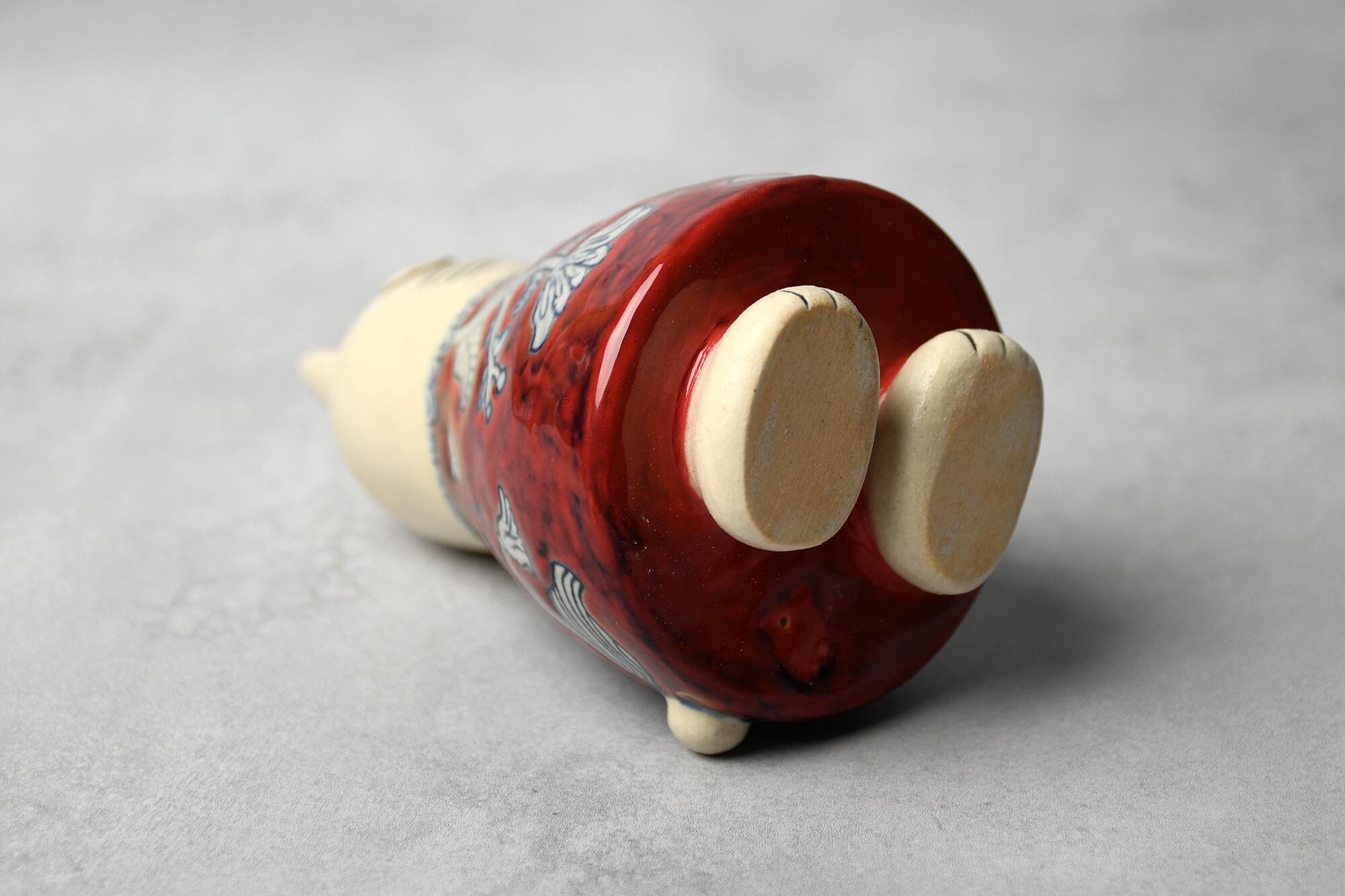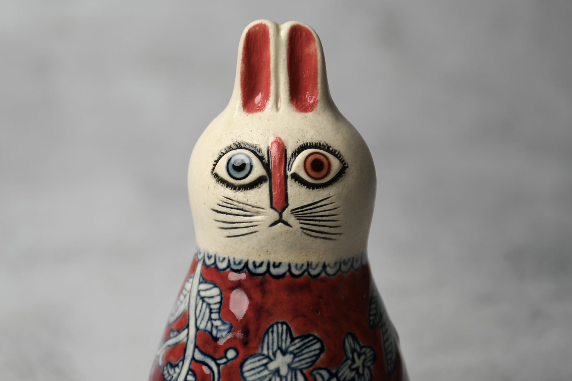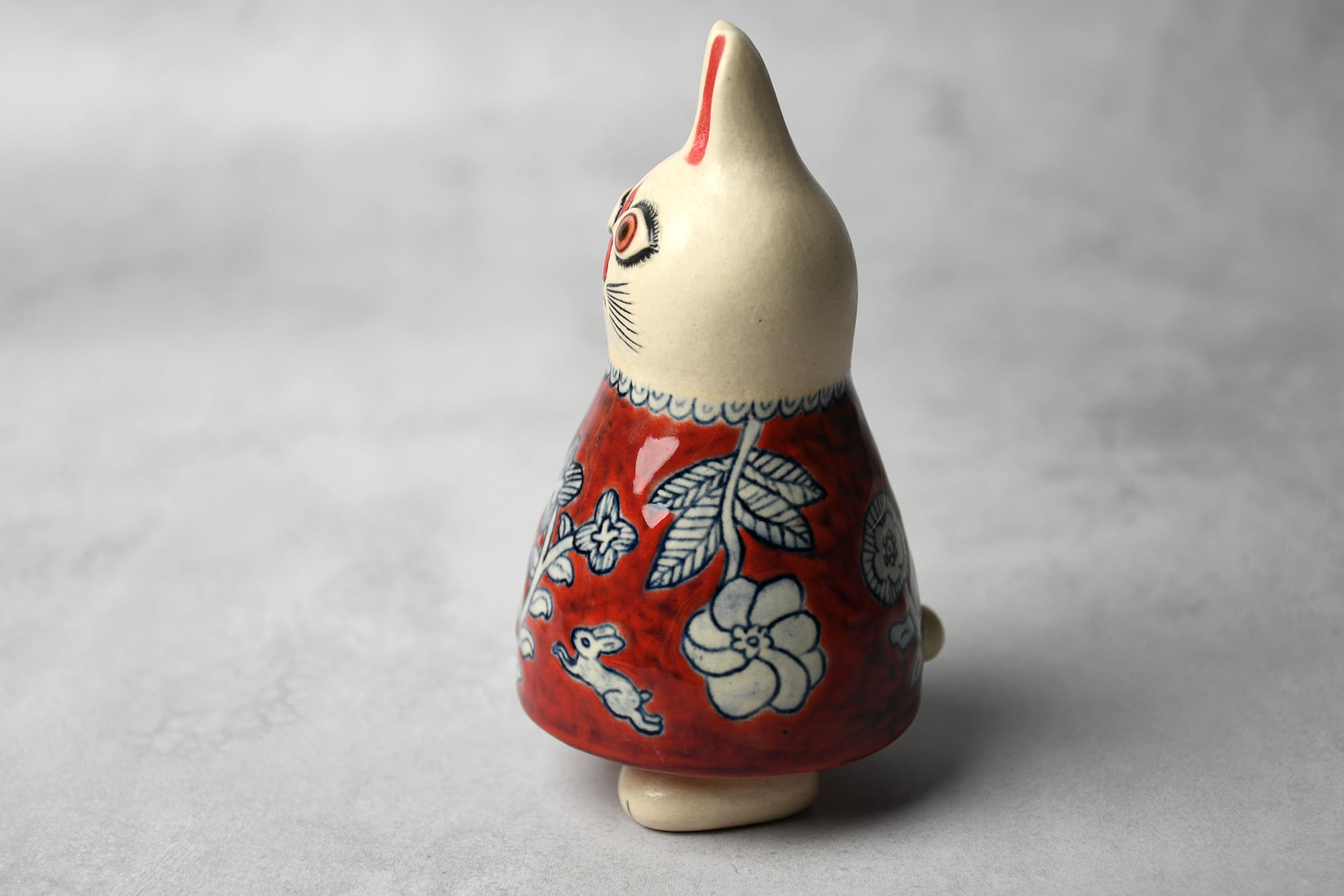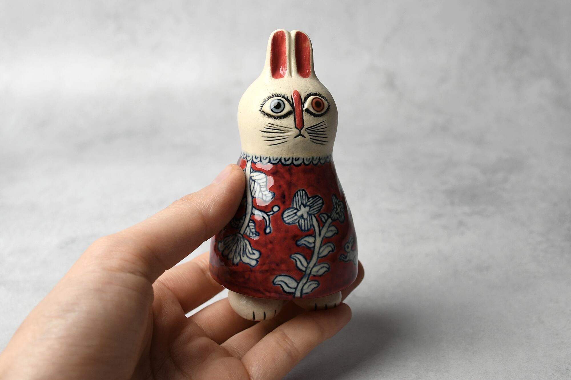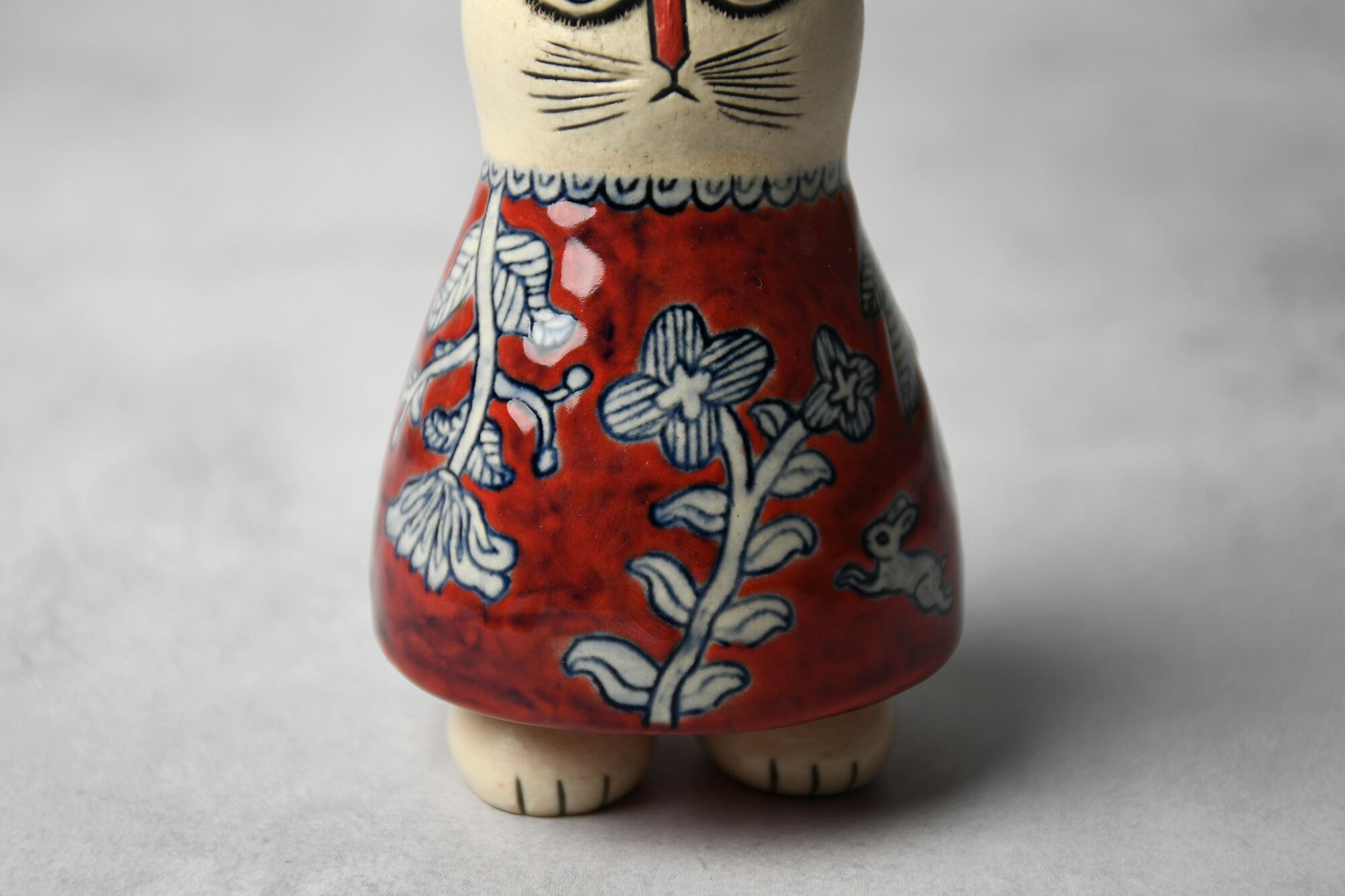 線刻・呉須染・釉彩...と様々な装飾を施した、小さな陶の人形です。いろんな模様のワンピースを着ています。空洞になったお腹の中には土のかけらが入っているので、振り動かすとささやかに音がします。首にお好みのリボンや糸を巻いてあげても可愛いですよ。