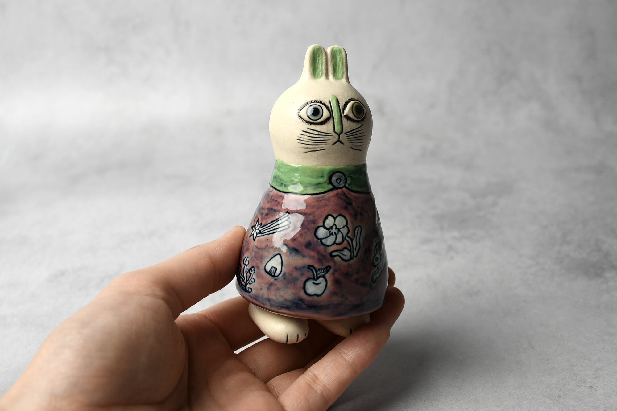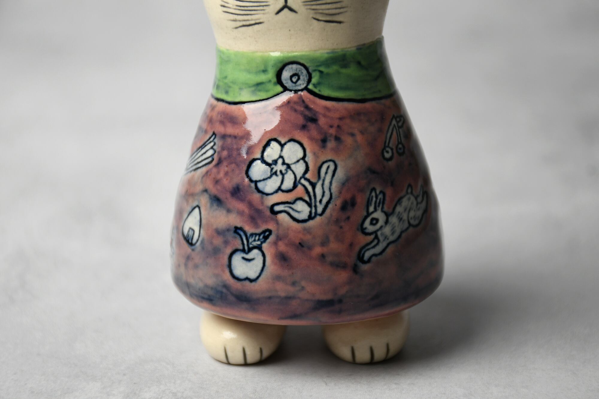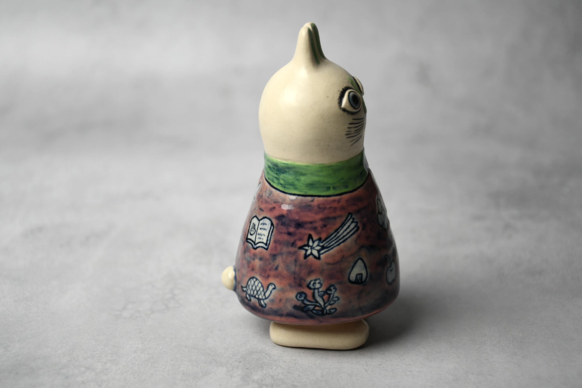 線刻・呉須染・釉彩...と様々な装飾を施した、小さな陶の人形です。いろんな模様のワンピースを着ています。空洞になったお腹の中には土のかけらが入っているので、振り動かすとささやかに音がします。首にお好みのリボンや糸を巻いてあげても可愛いですよ。