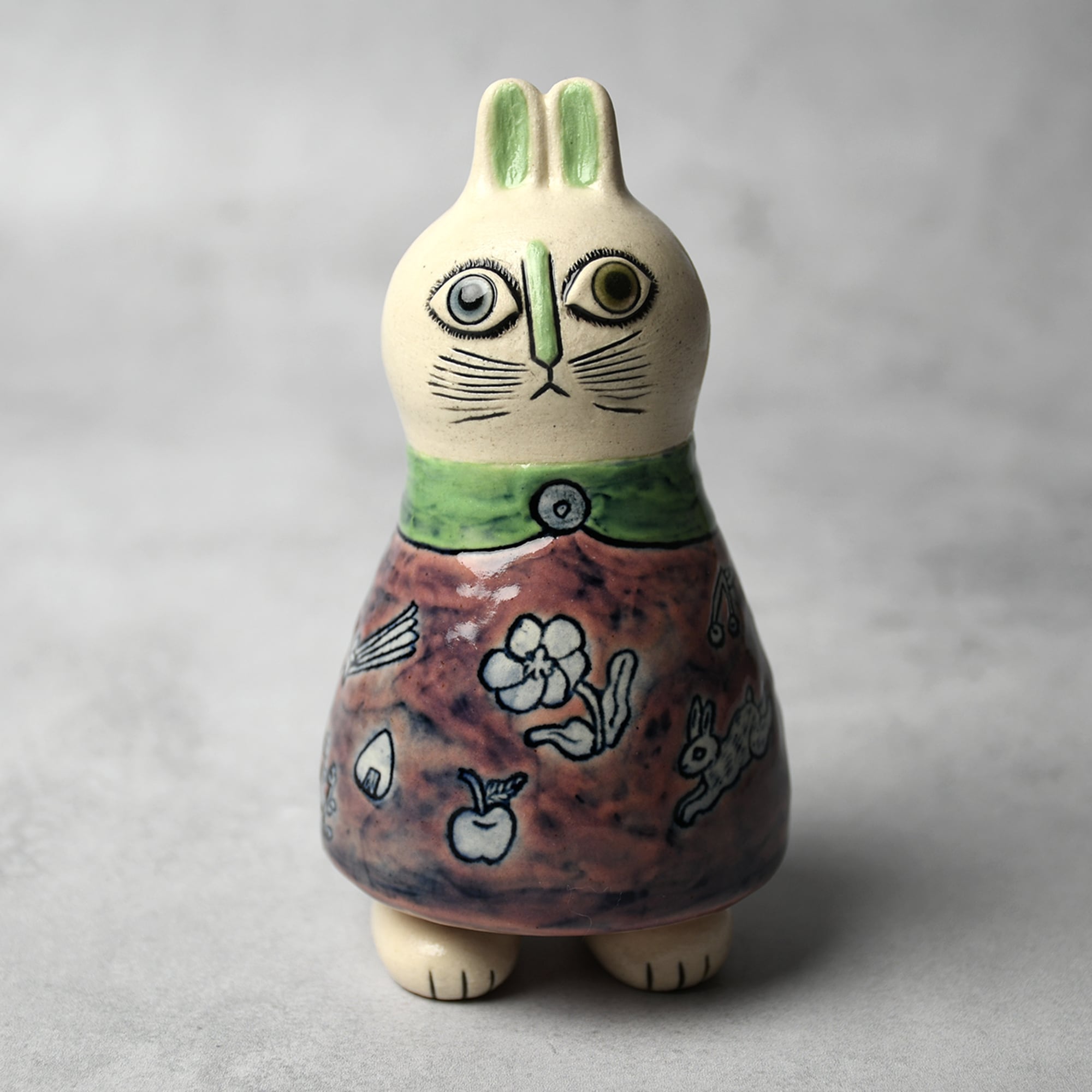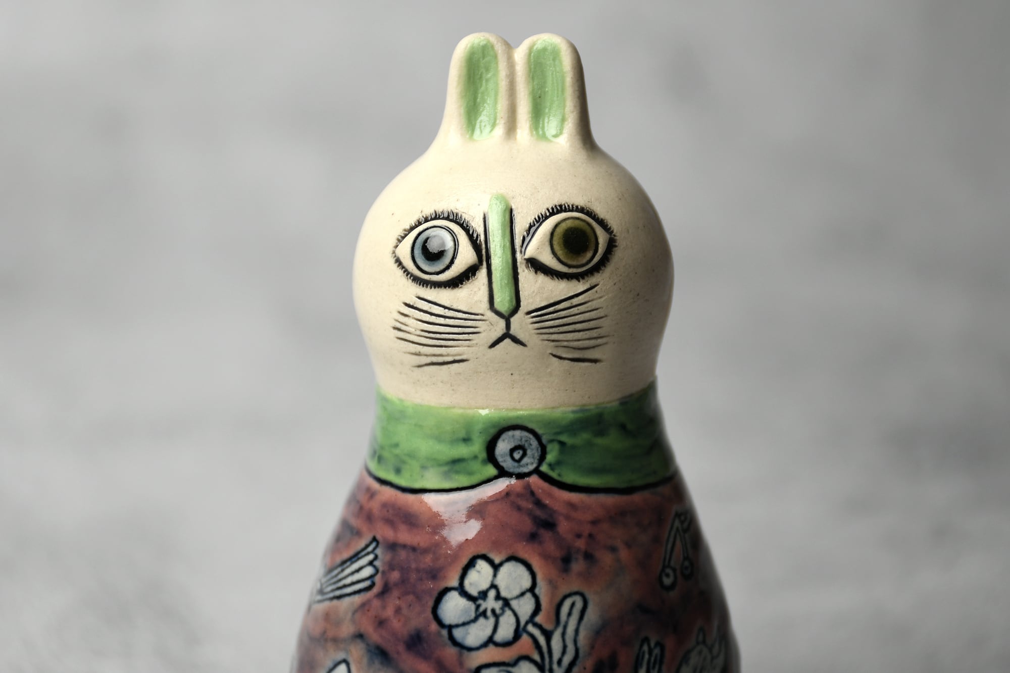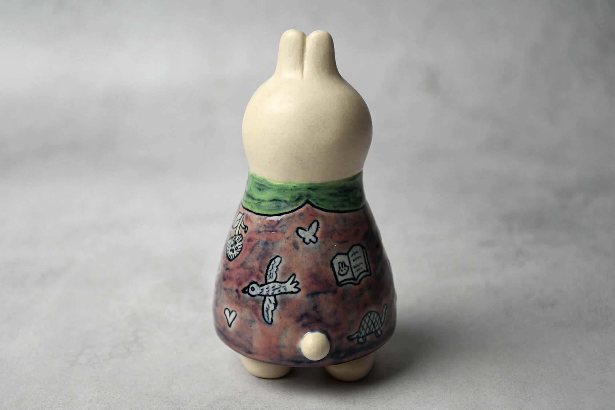 線刻・呉須染・釉彩...と様々な装飾を施した、小さな陶の人形です。いろんな模様のワンピースを着ています。空洞になったお腹の中には土のかけらが入っているので、振り動かすとささやかに音がします。首にお好みのリボンや糸を巻いてあげても可愛いですよ。