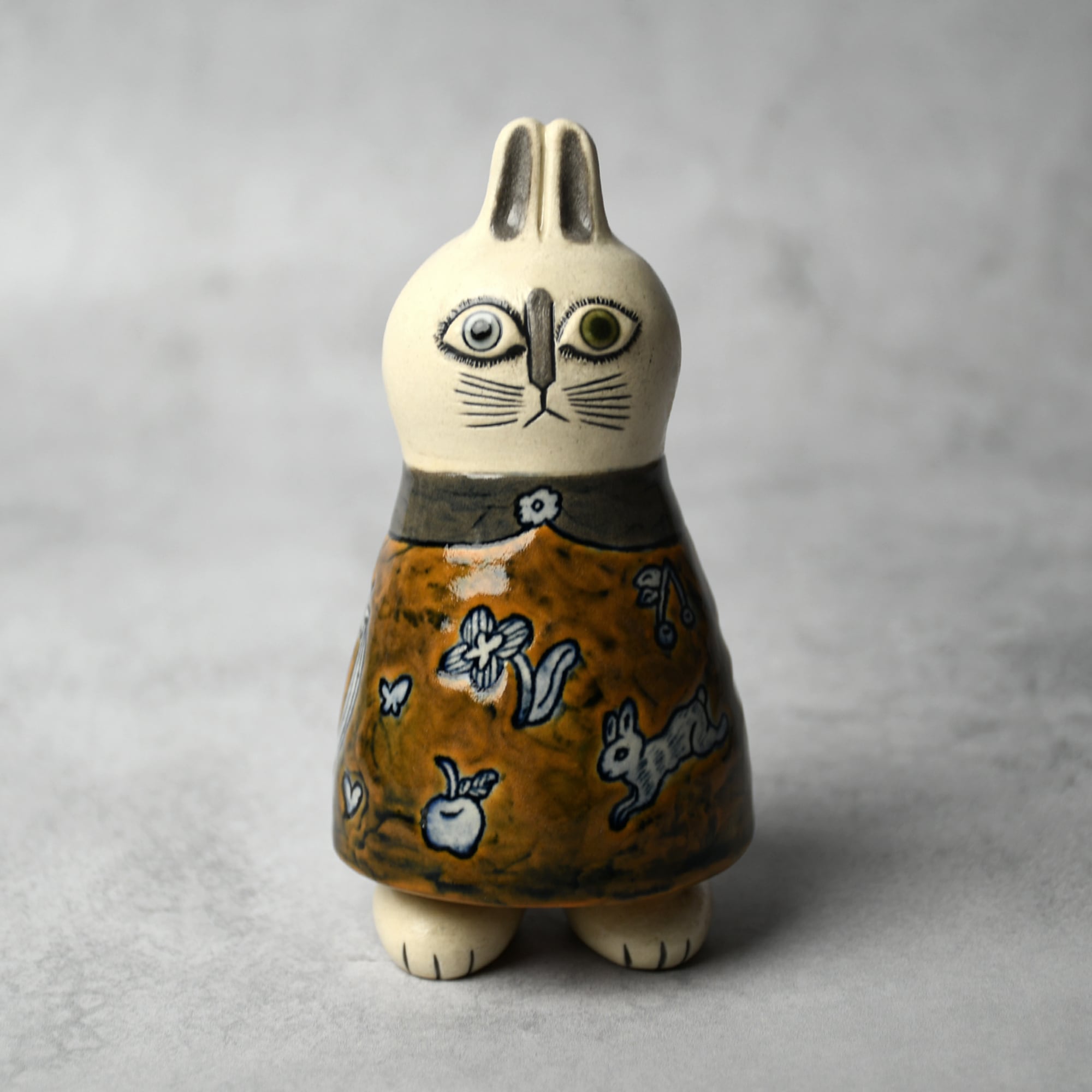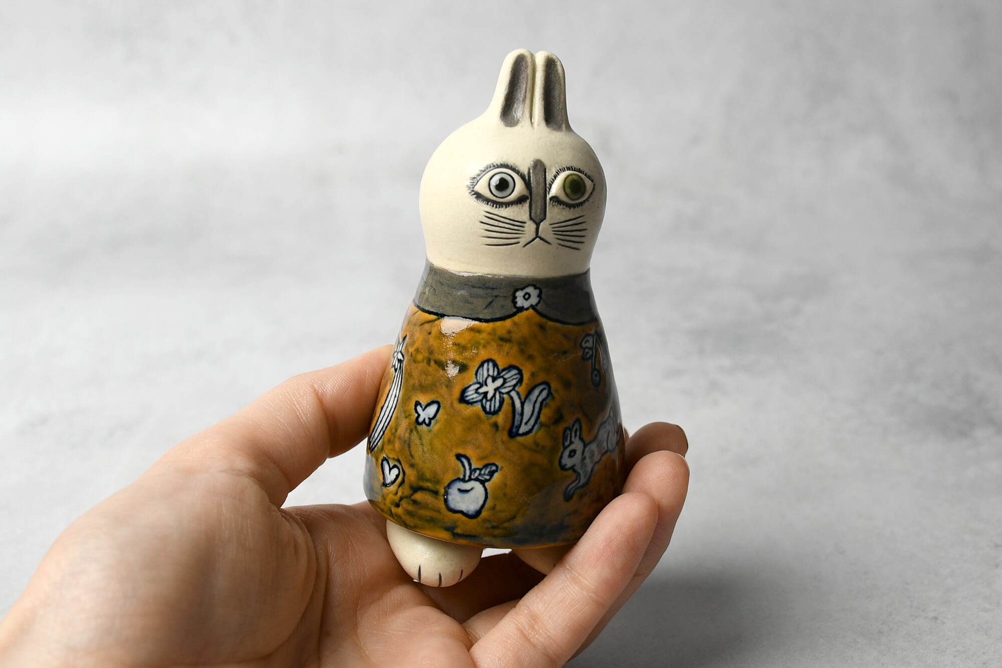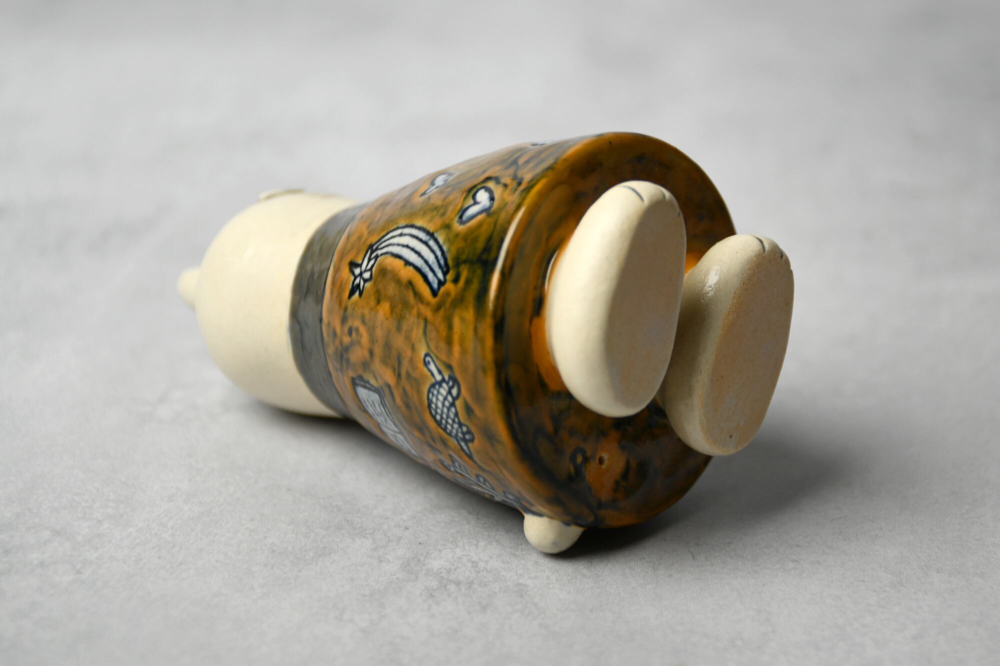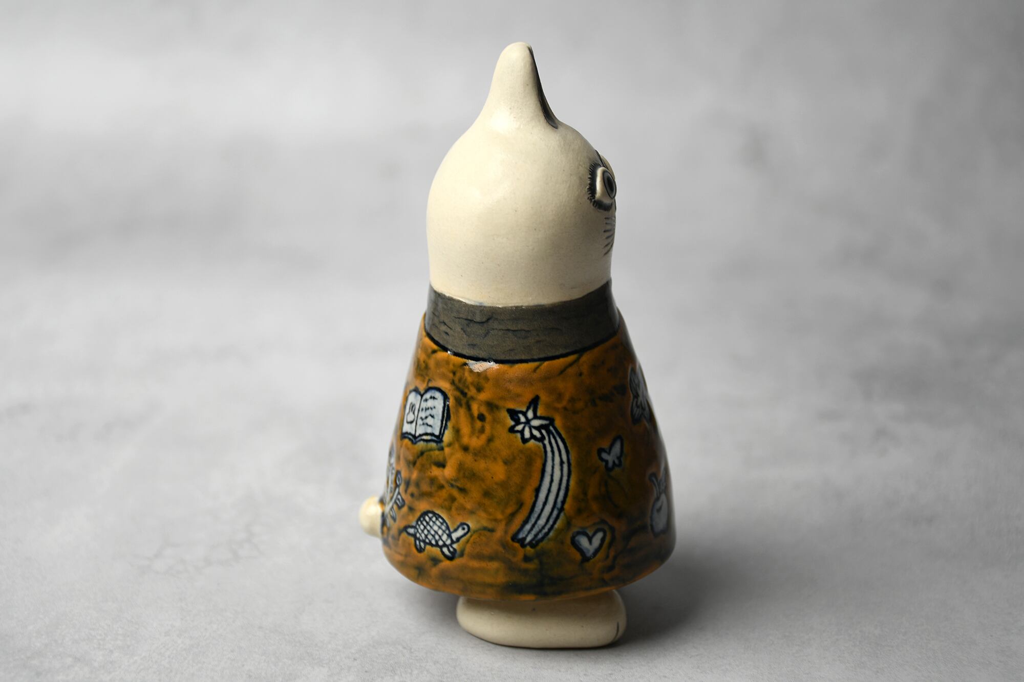 線刻・呉須染・釉彩...と様々な装飾を施した、小さな陶の人形です。いろんな模様のワンピースを着ています。空洞になったお腹の中には土のかけらが入っているので、振り動かすとささやかに音がします。首にお好みのリボンや糸を巻いてあげても可愛いですよ。
