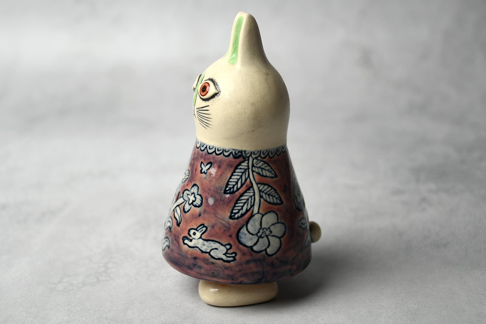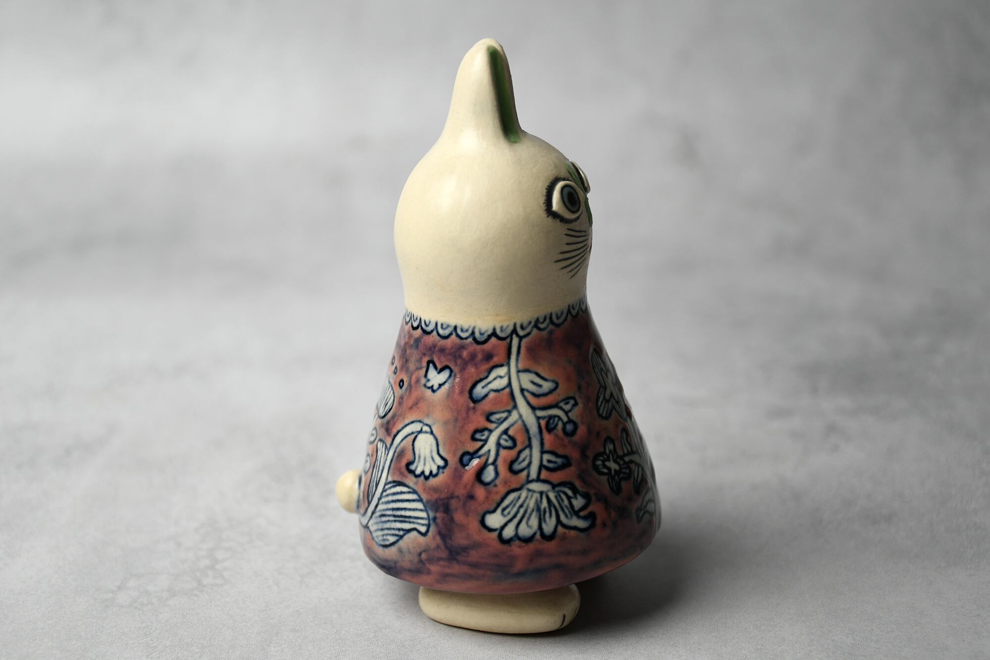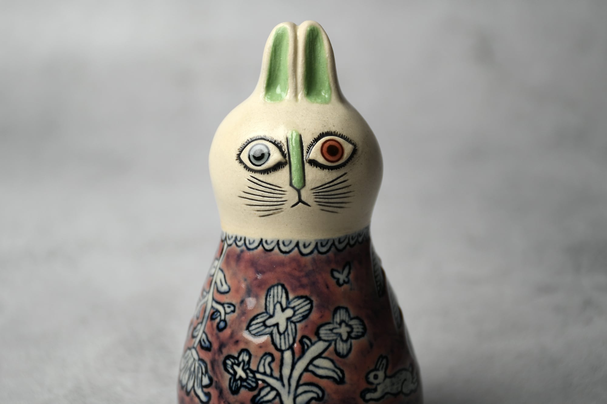 線刻・呉須染・釉彩...と様々な装飾を施した、小さな陶の人形です。いろんな模様のワンピースを着ています。空洞になったお腹の中には土のかけらが入っているので、振り動かすとささやかに音がします。首にお好みのリボンや糸を巻いてあげても可愛いですよ。