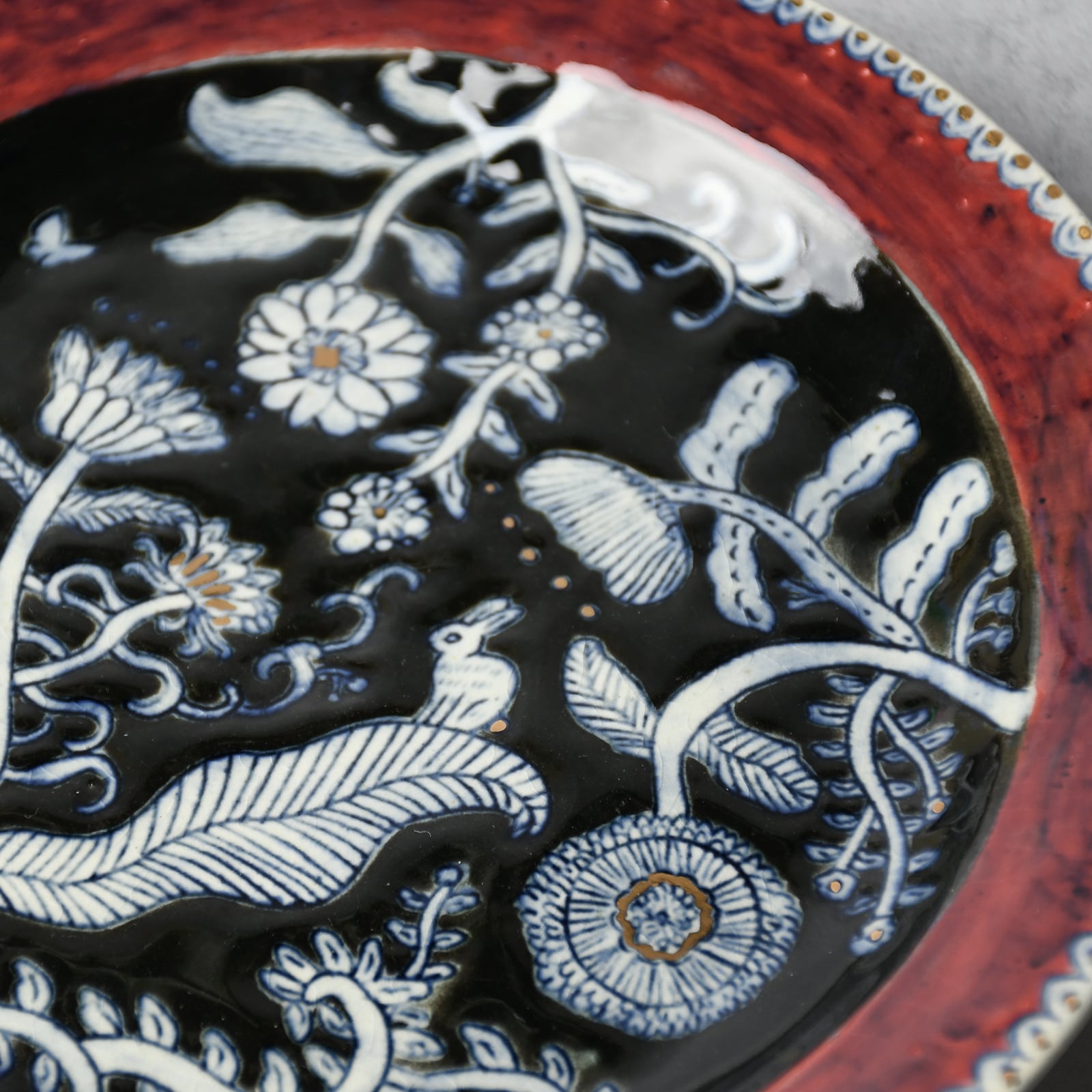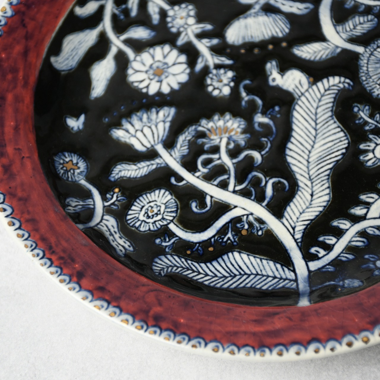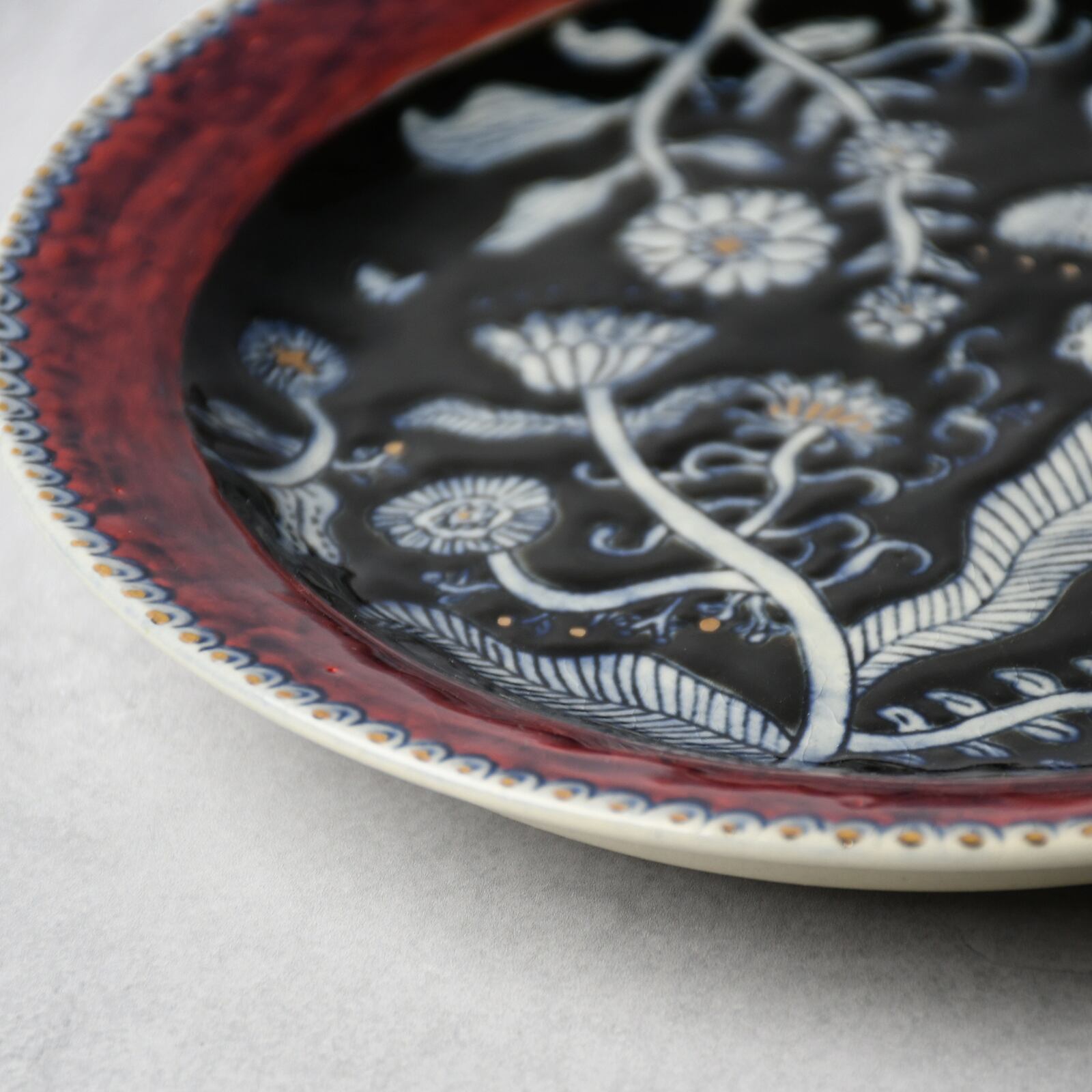 線刻・呉須染・釉彩・金彩...と様々な装飾を施した、6寸サイズの絵皿です。線はカリカリと針のような道具で彫っており、なぞると少し凹凸があります。光の当たり方や角度によって見え方の変化する、絵画のような1枚です。
