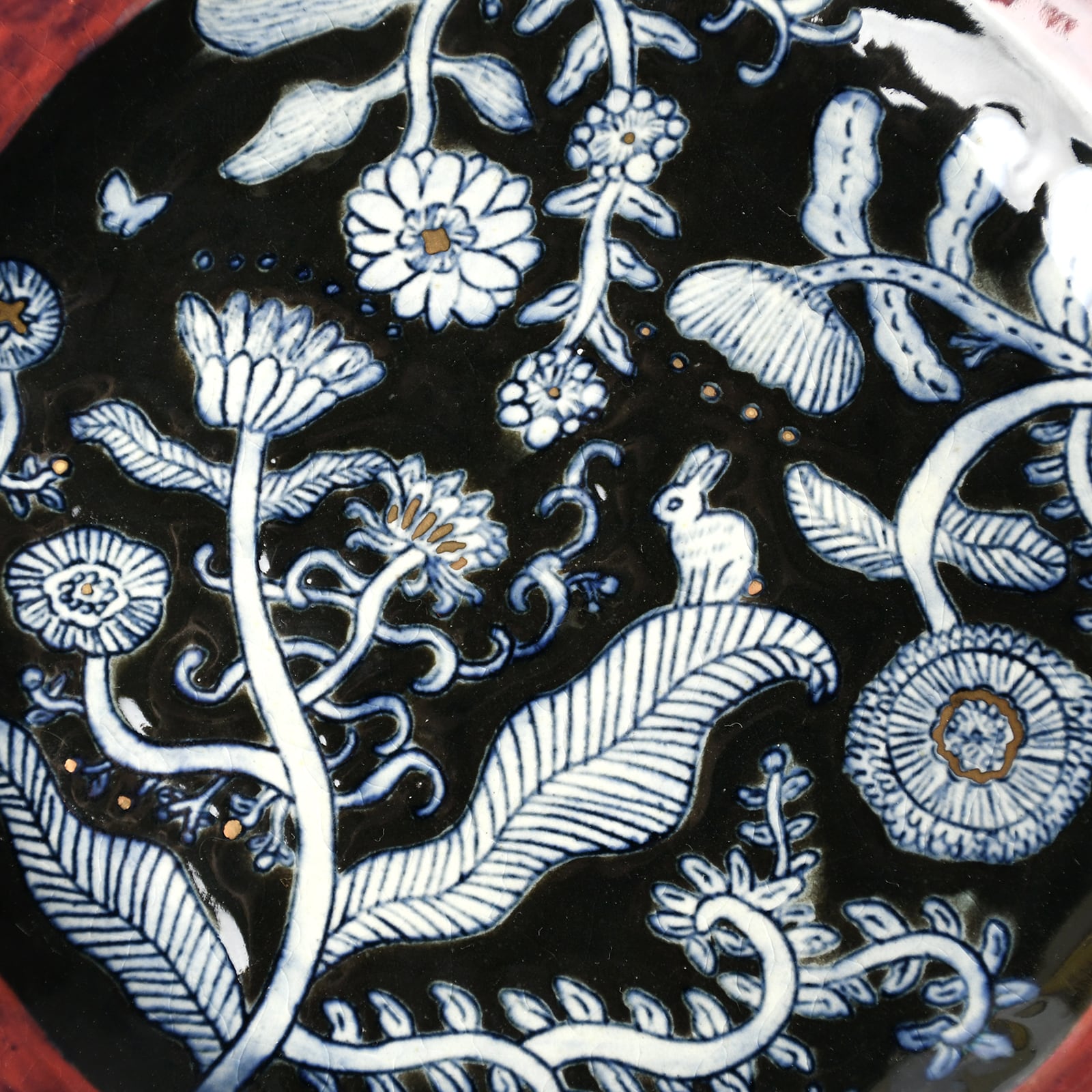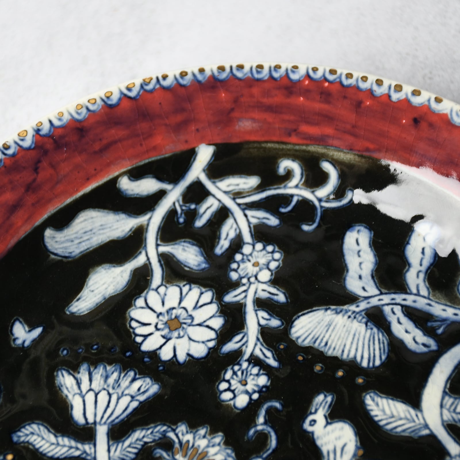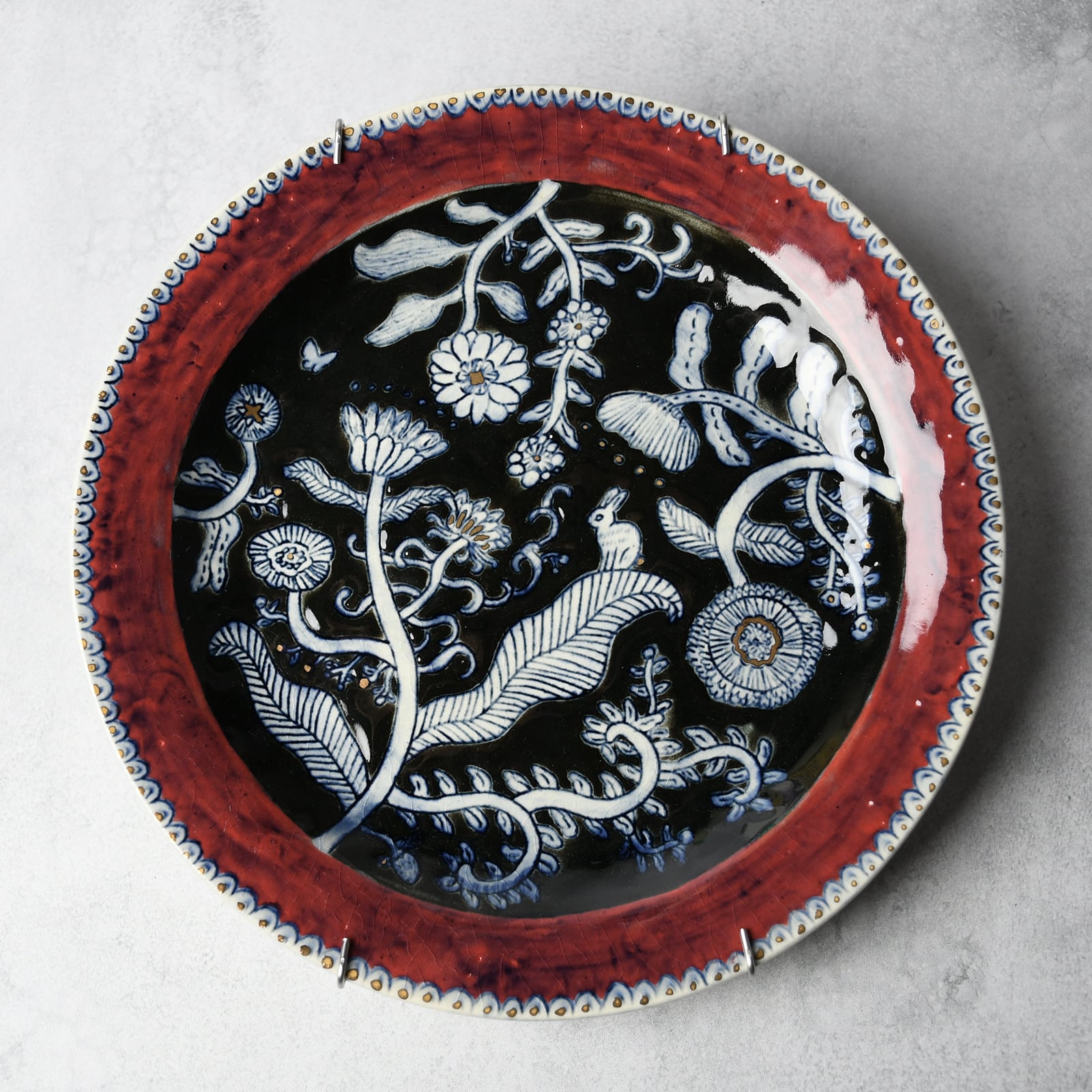 線刻・呉須染・釉彩・金彩...と様々な装飾を施した、6寸サイズの絵皿です。線はカリカリと針のような道具で彫っており、なぞると少し凹凸があります。光の当たり方や角度によって見え方の変化する、絵画のような1枚です。