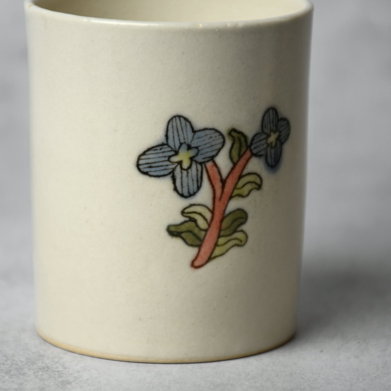 線はカリカリと針のような道具で彫っており、なぞると少し凹凸があります。着彩はガラス質の釉薬で行い、一般的な下絵・上絵の焼き物と比べて透明度と彩度が高いのが特徴です。全体にはセミマットの白い釉薬を掛けてあるので、ガラス部分のツヤツヤ感との差異も面白いです。