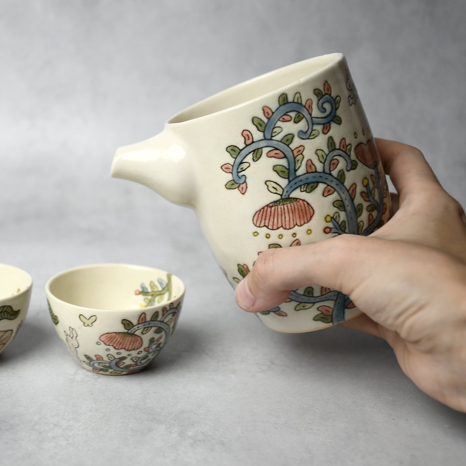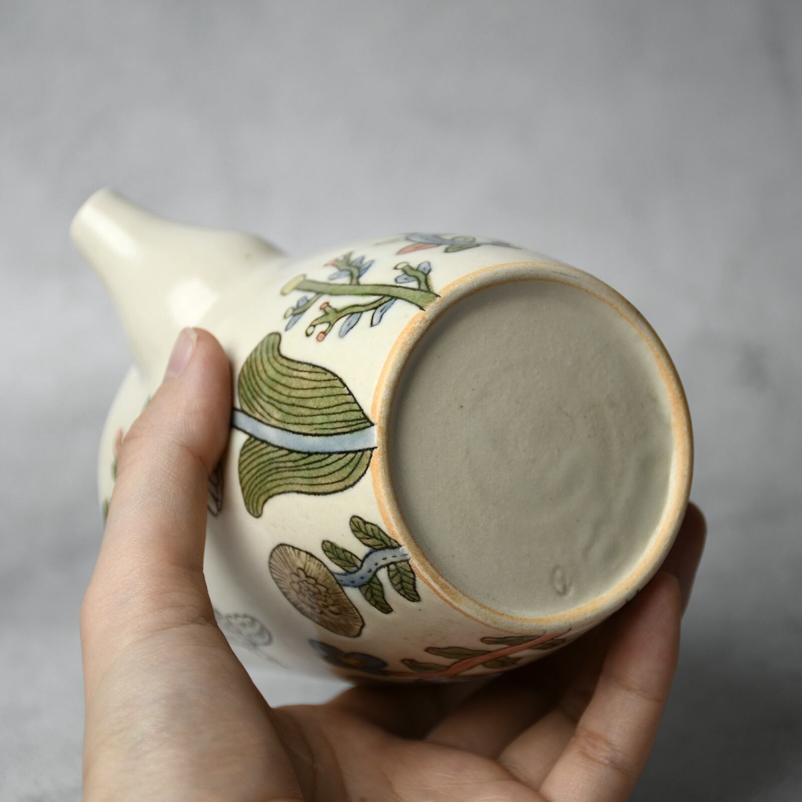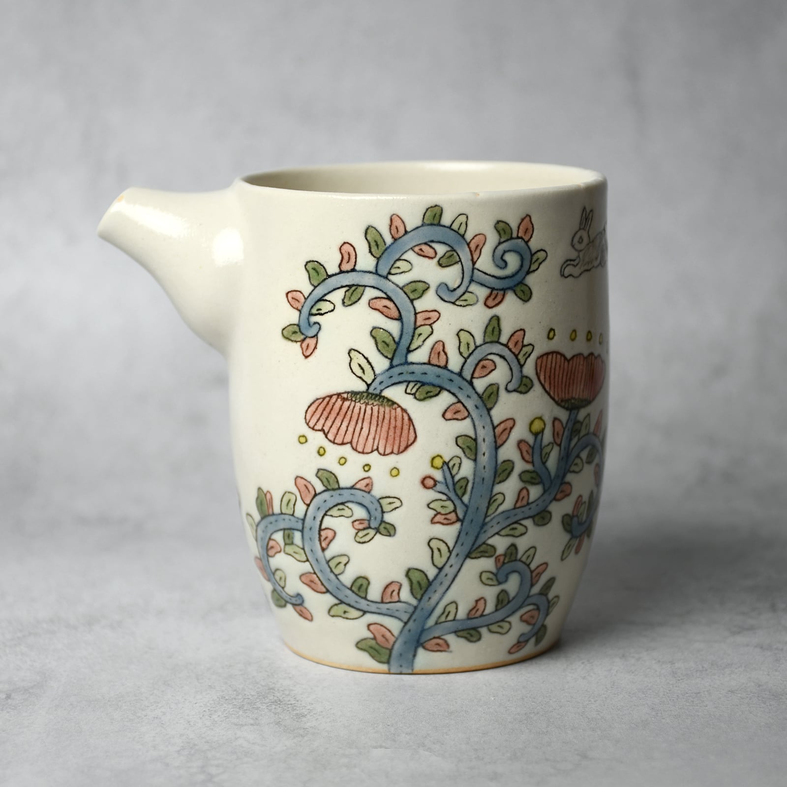 線刻と釉彩による装飾を施した、片口です。日本酒のお供にはもちろん、お茶の湯冷ましとしてもお使いいただけます。同シリーズのおちょこと組み合わせていただくのもおすすめ。きちんと水切れしますが、金属器のようにキレッキレではありません。そうっ...と注いでくださいね。
