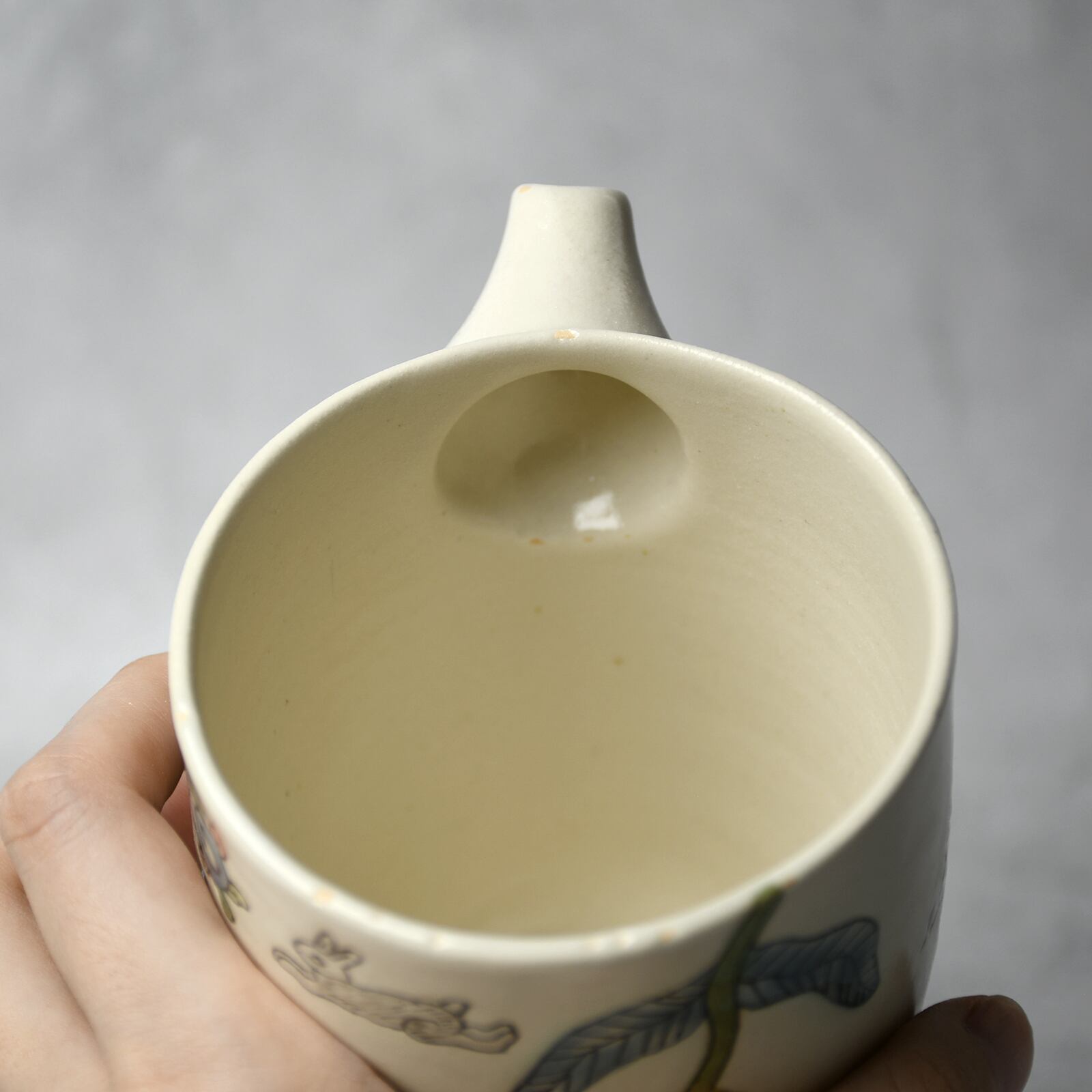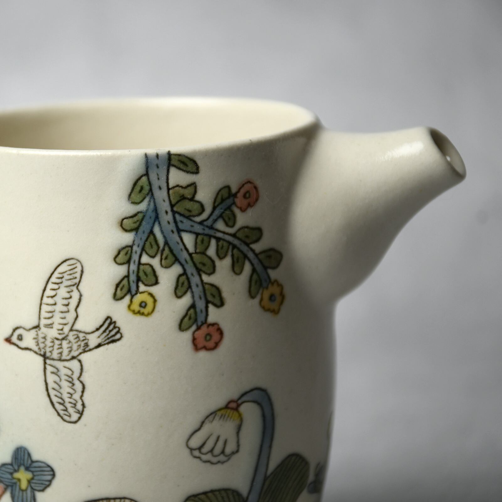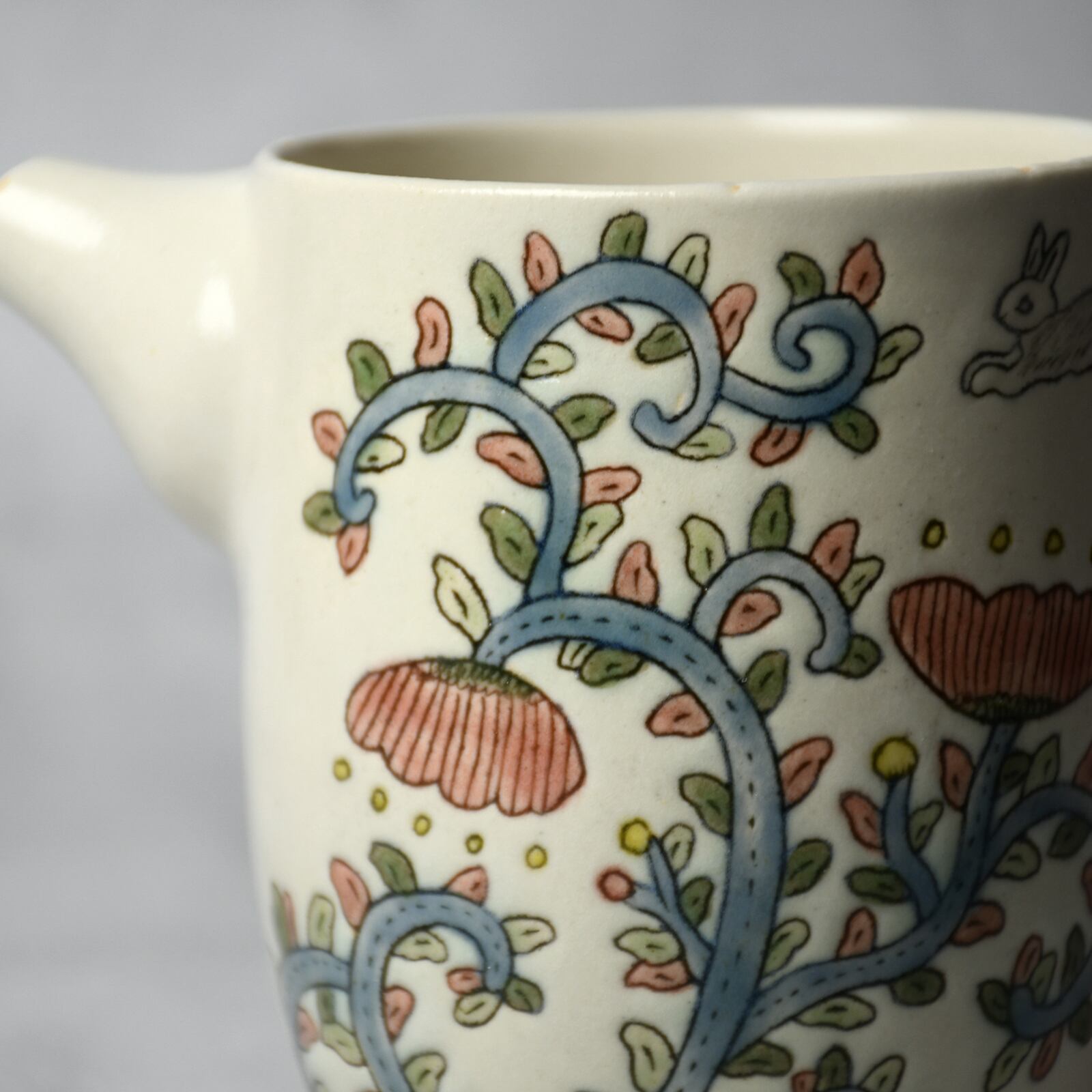 線刻と釉彩による装飾を施した、片口です。日本酒のお供にはもちろん、お茶の湯冷ましとしてもお使いいただけます。同シリーズのおちょこと組み合わせていただくのもおすすめ。きちんと水切れしますが、金属器のようにキレッキレではありません。そうっ...と注いでくださいね。