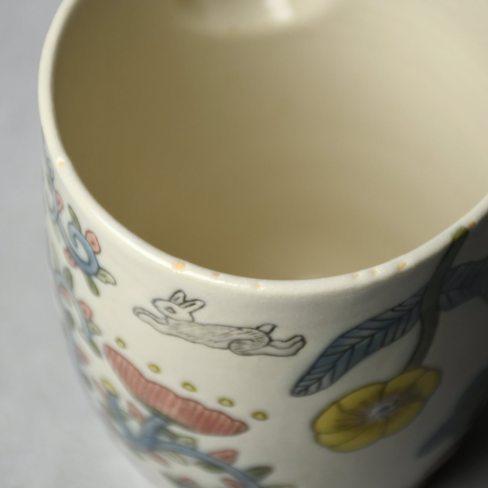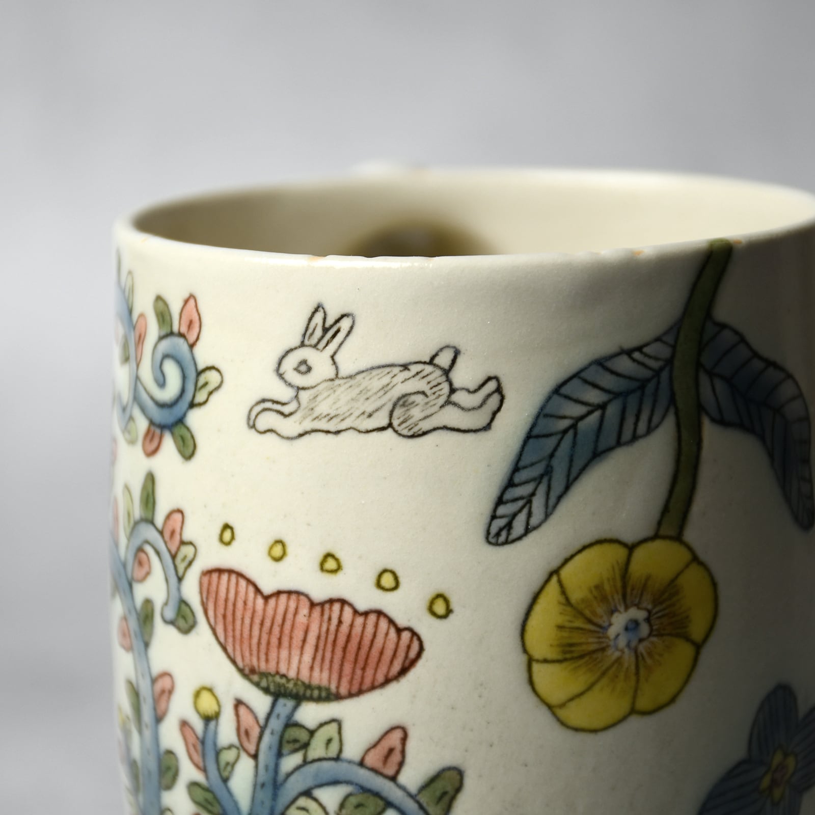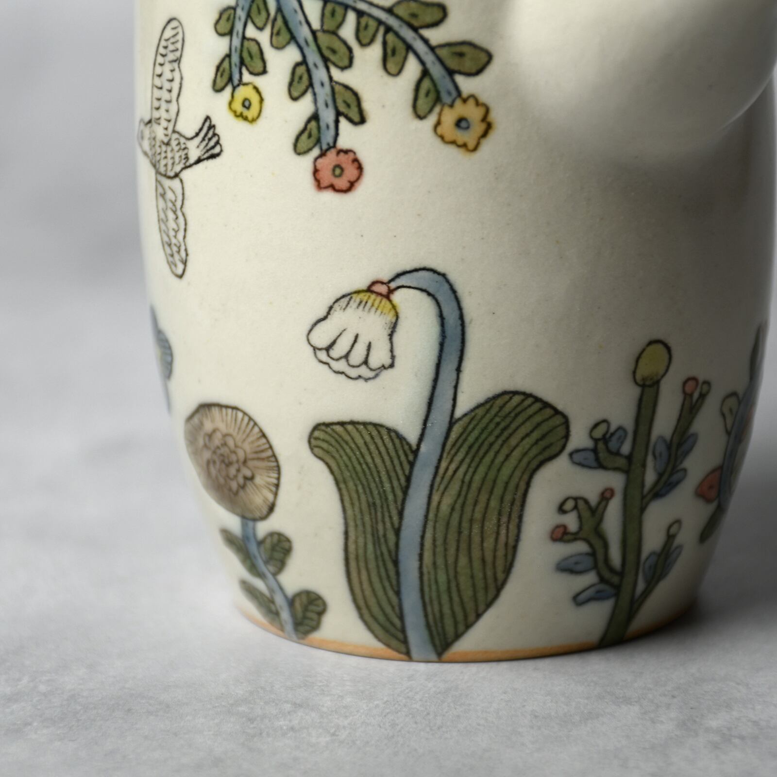 線はカリカリと針のような道具で彫っており、なぞると少し凹凸があります。着彩はガラス質の釉薬で行い、一般的な下絵・上絵の焼き物と比べて透明度と彩度が高いのが特徴です。全体にはセミマットの白い釉薬を掛けてあるので、ガラス部分のツヤツヤ感との違いも面白いです。