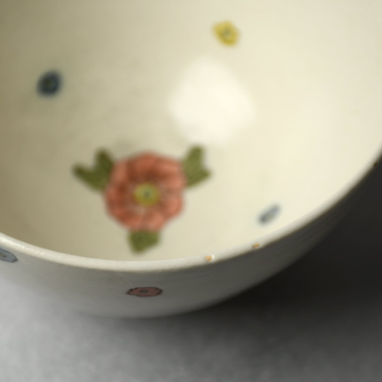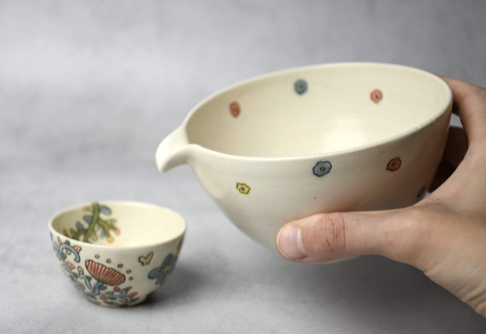 線はカリカリと針のような道具で彫っており、なぞると少し凹凸があります。着彩はガラス質の釉薬で行い、一般的な下絵・上絵の焼き物と比べて透明度と彩度が高いのが特徴です。全体にはセミマットの白い釉薬を掛けてあるので、ガラス部分のツヤツヤ感との違いも面白いです。