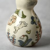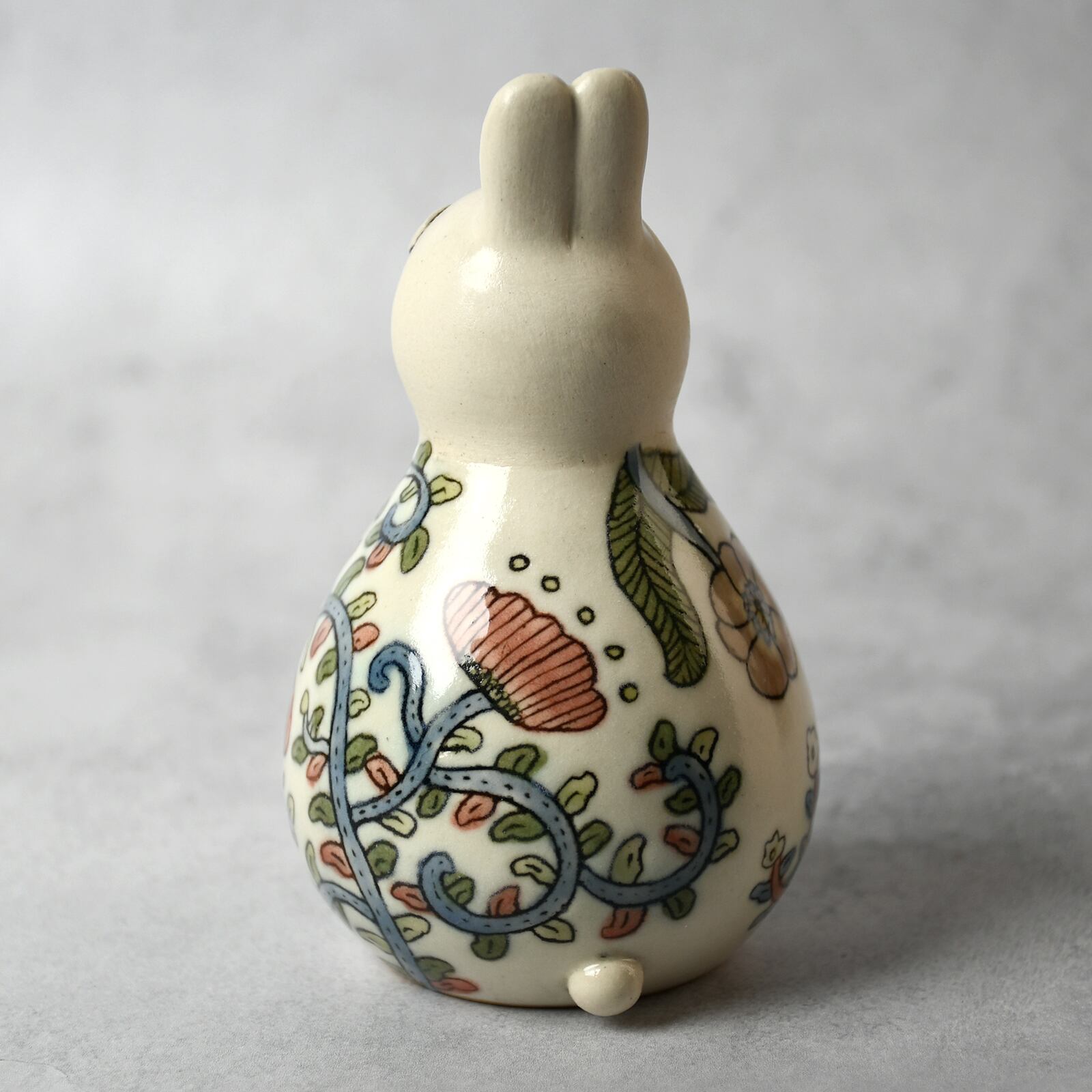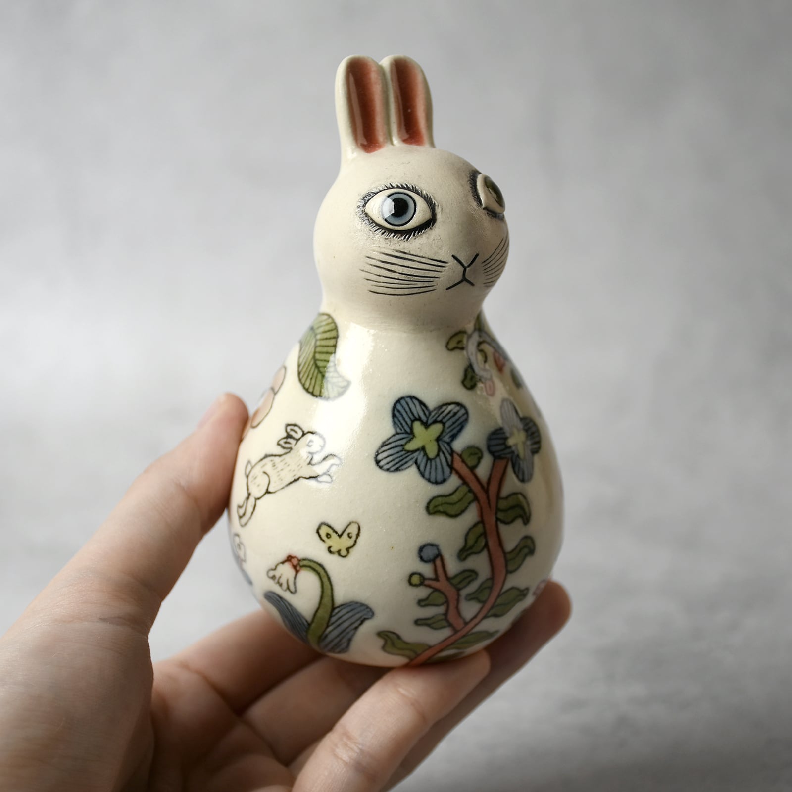 イースターエッグをイメージして作り始めた、うさぎの陶人形です。目力がすごいです。