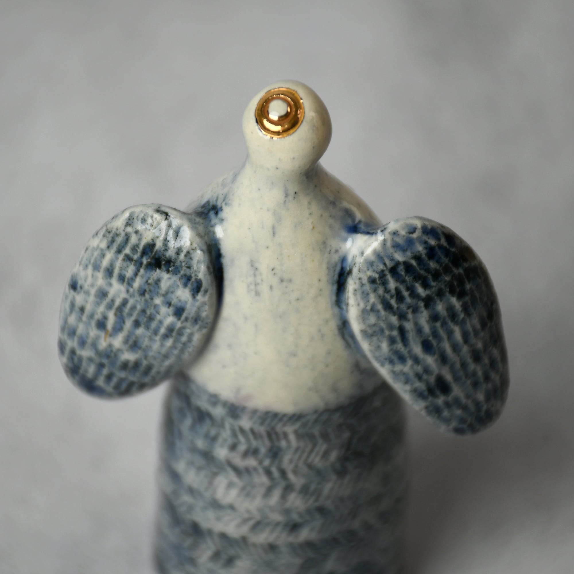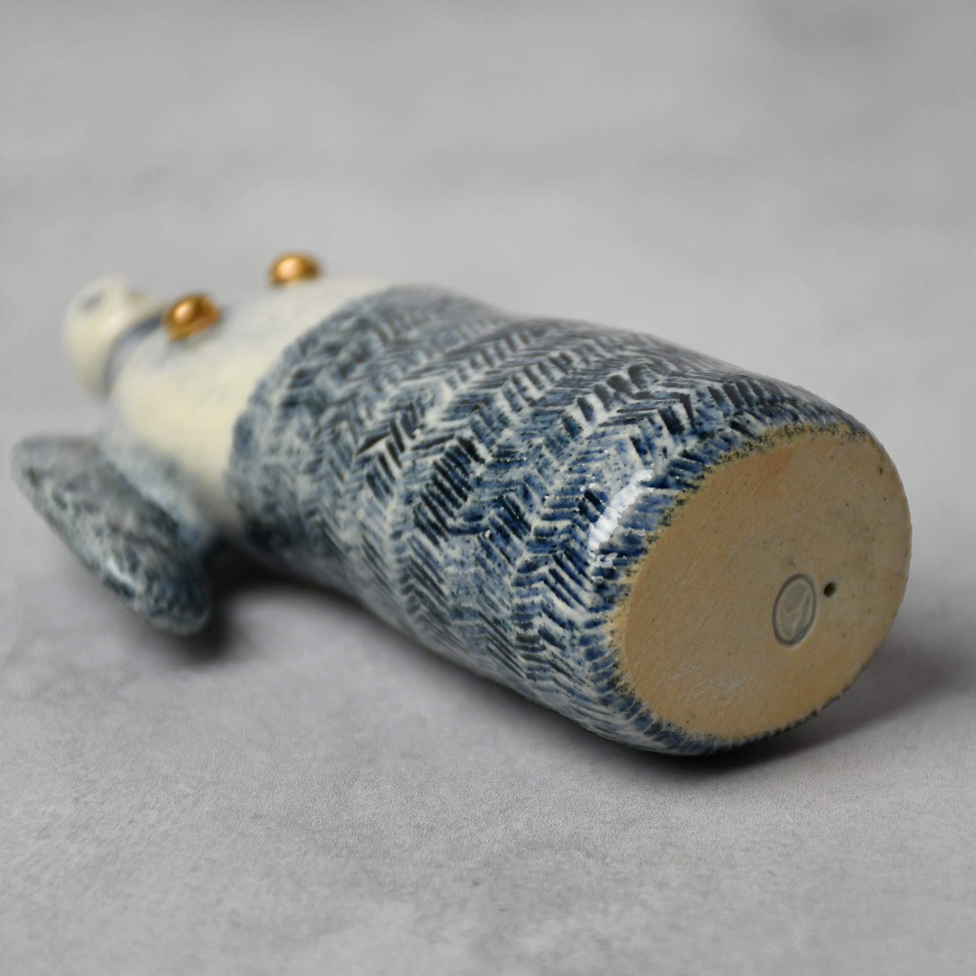 ・お顔や模様は彫りで表現しており、手に取ると凹凸を感じられます。落ち着いた色調の呉須(ごす)のブルーに、ピカピカの金彩を加えています。