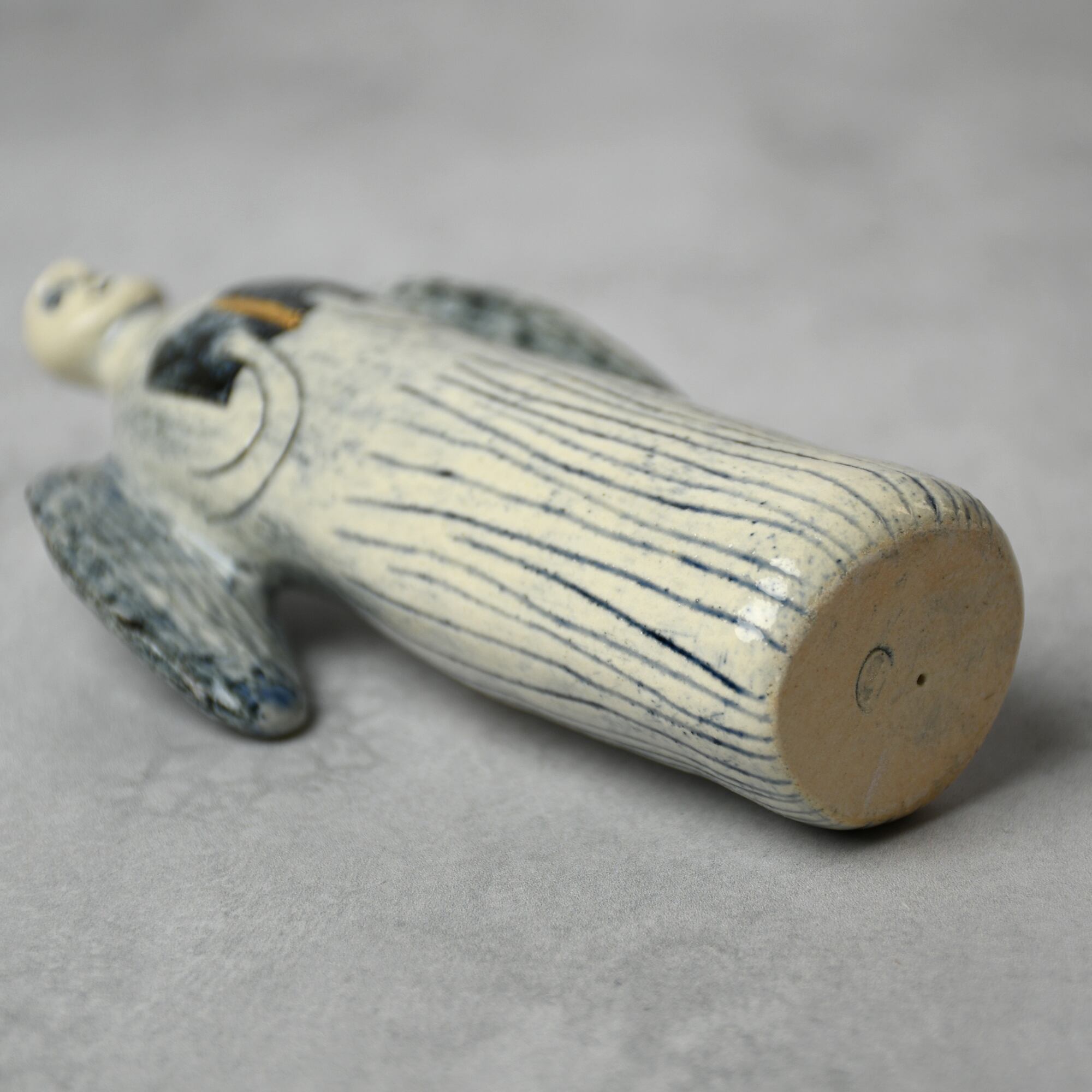 ・お顔や模様は彫りで表現しており、手に取ると凹凸を感じられます。落ち着いた色調の呉須(ごす)のブルーに、ピカピカの金彩を加えています。