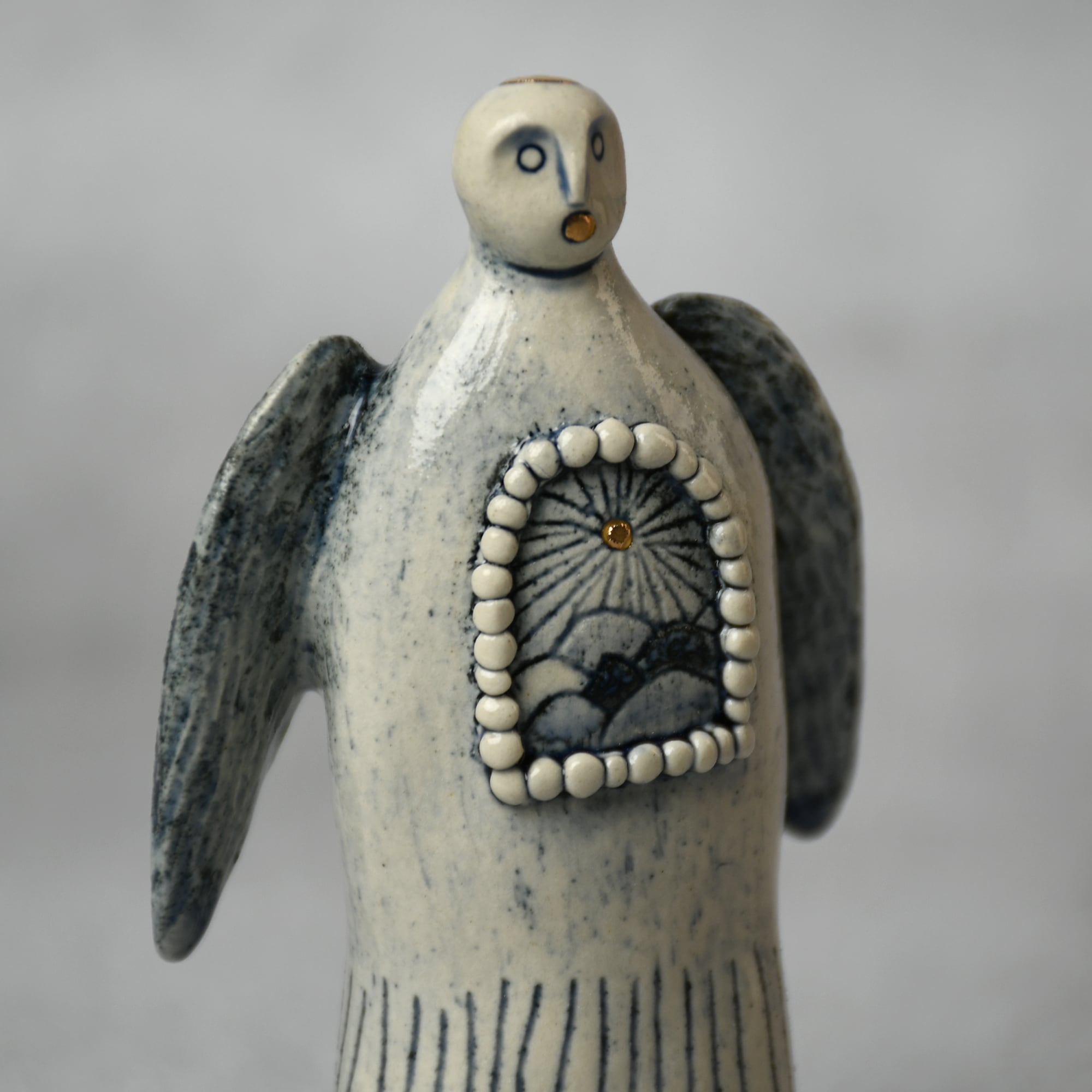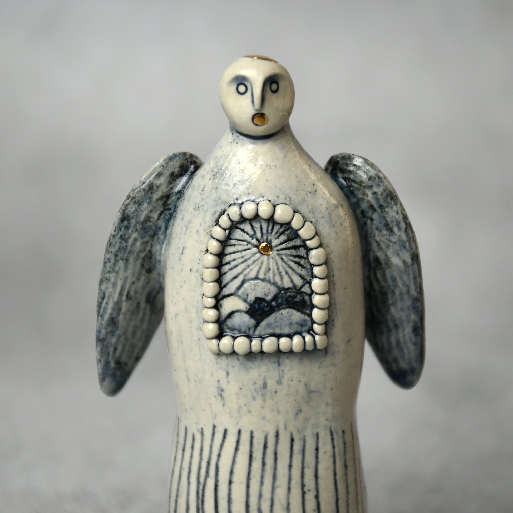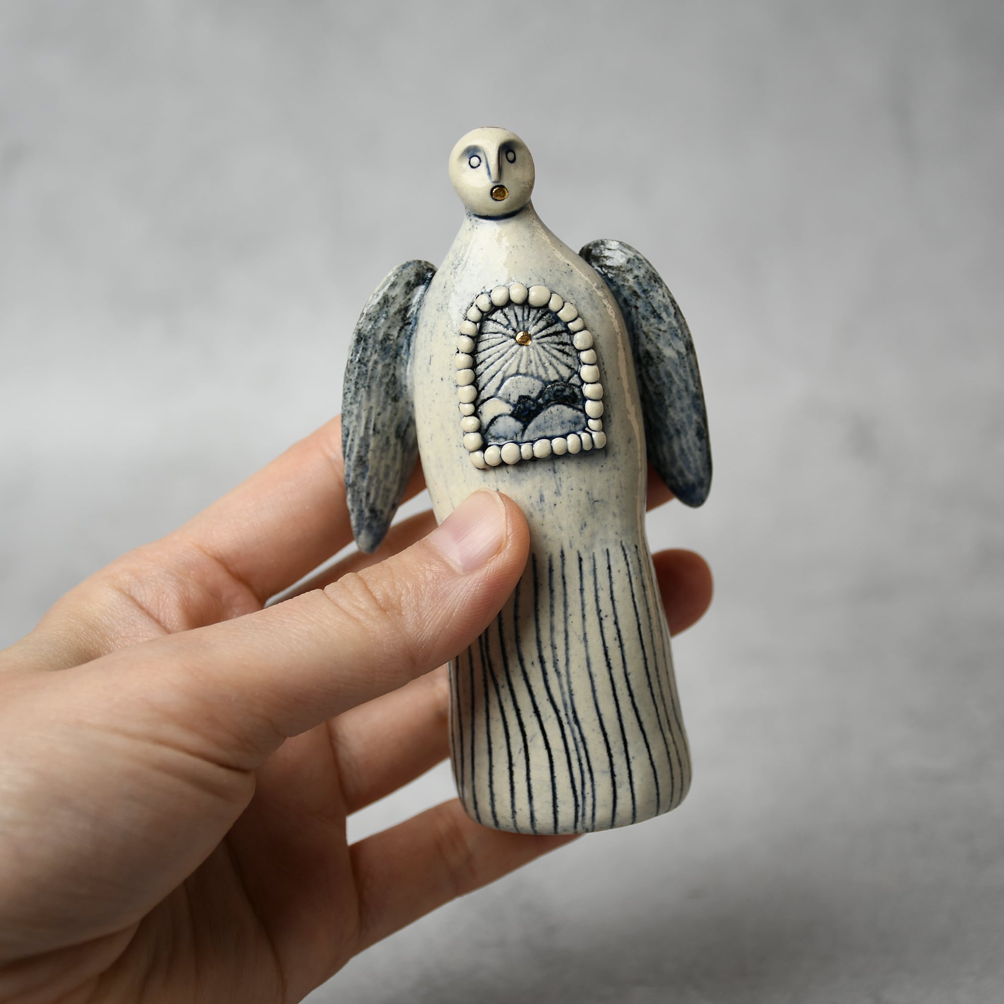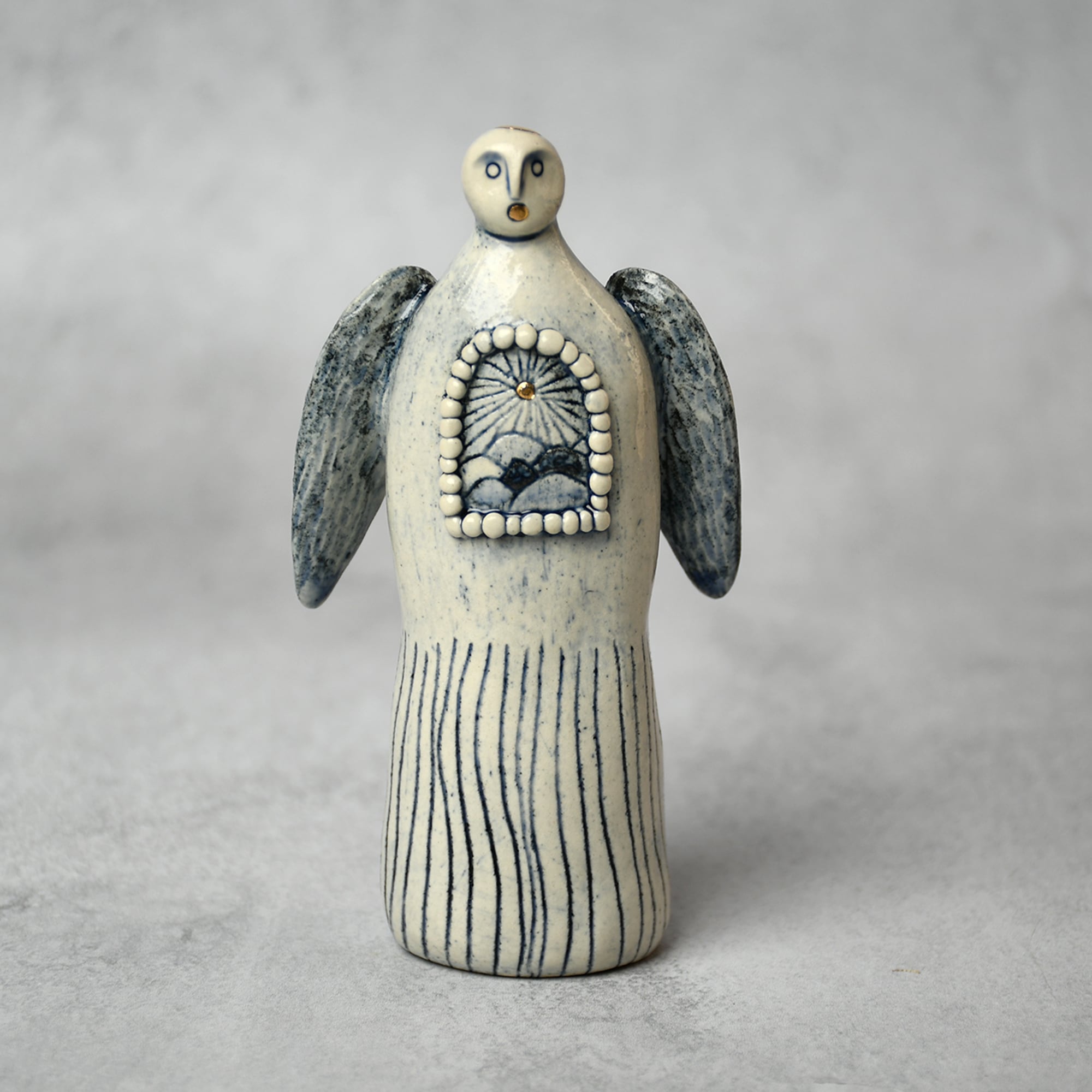 小さな命を祈って、こねこね手を動かしているうちに生まれてきた陶の天使。いつのまにか胸に窓がついたり、お花が咲いたり、しっぽが生えたり...不思議な姿に変化してきました。お守りとしてお部屋の片隅に居させてもらえたらいいな。みなさまに幸せを運びますように。