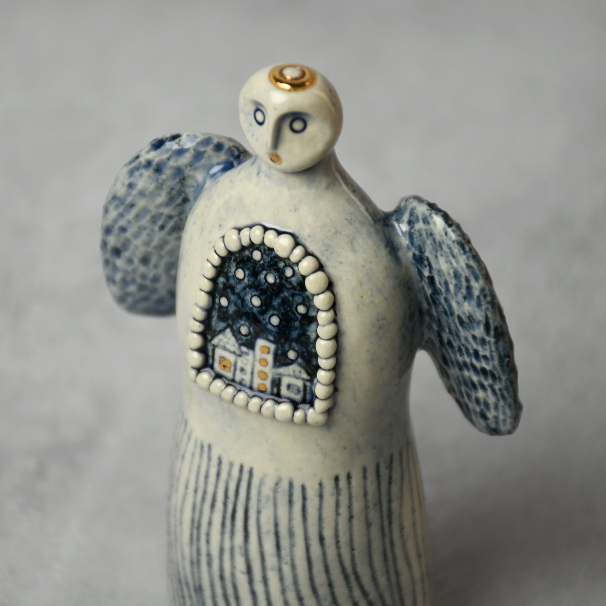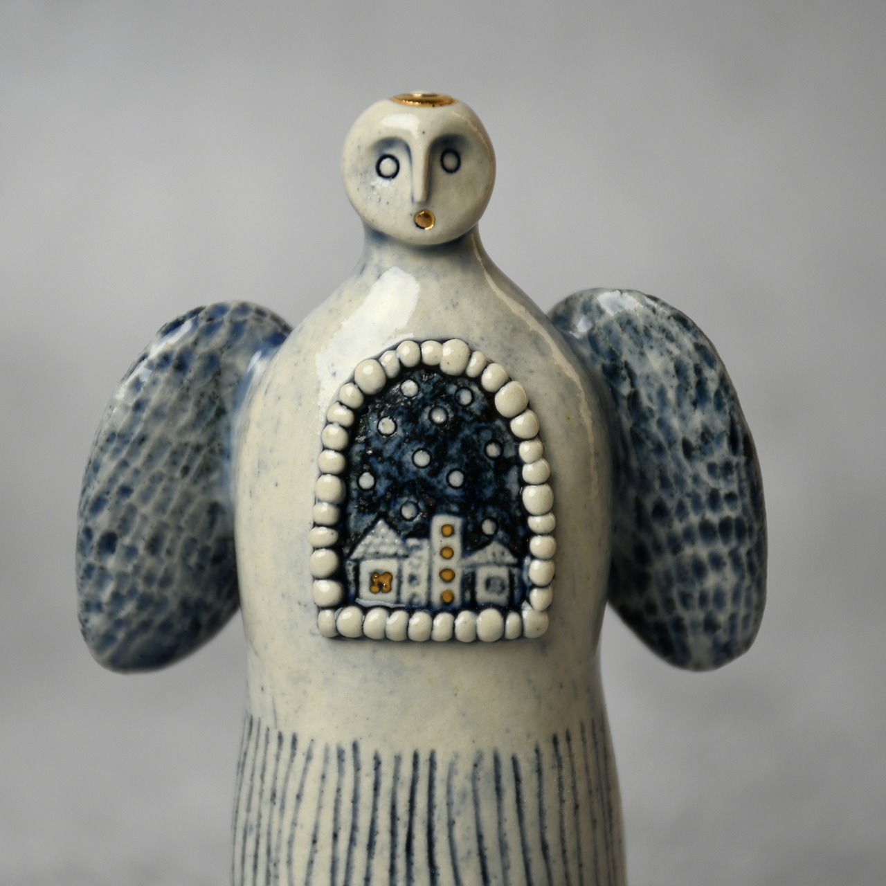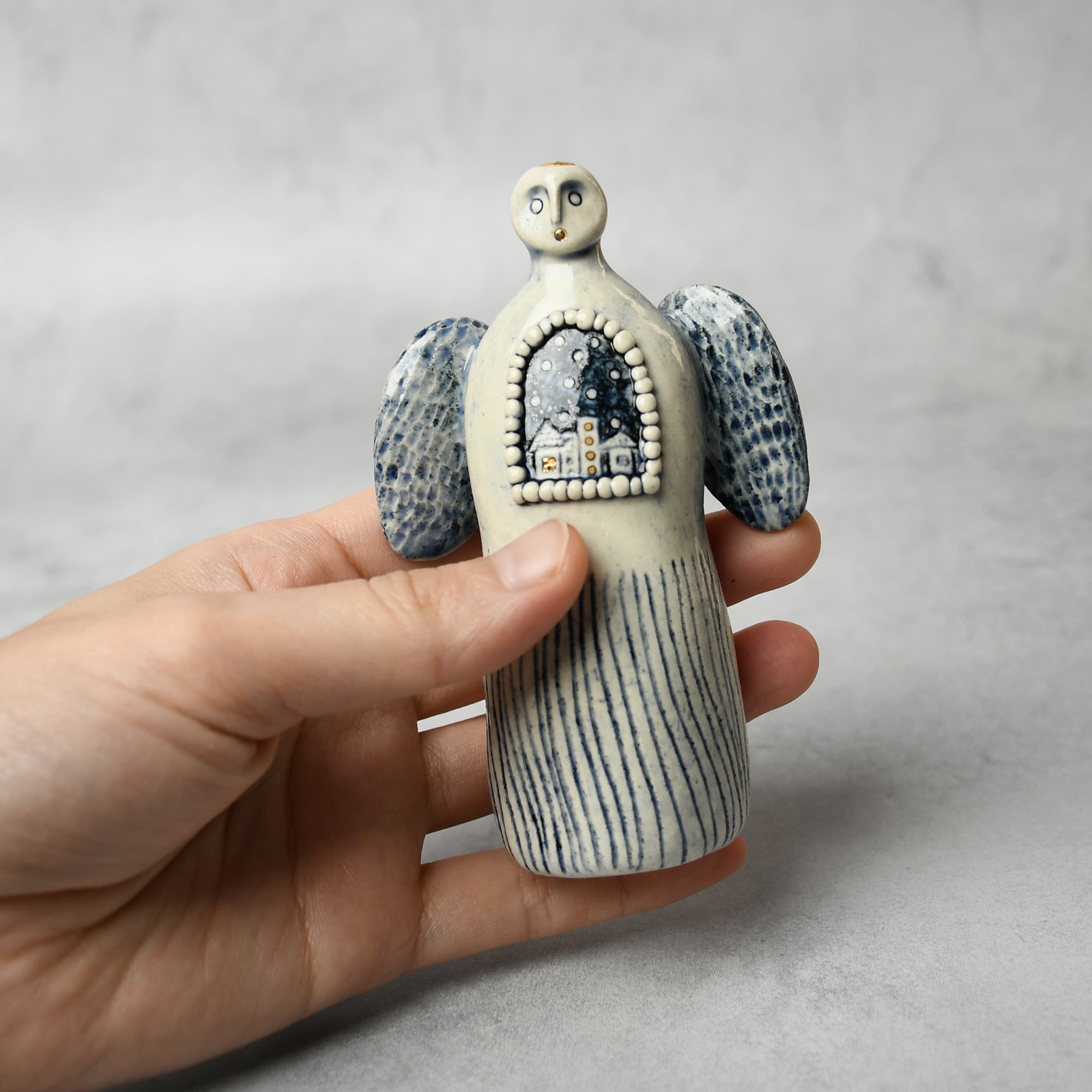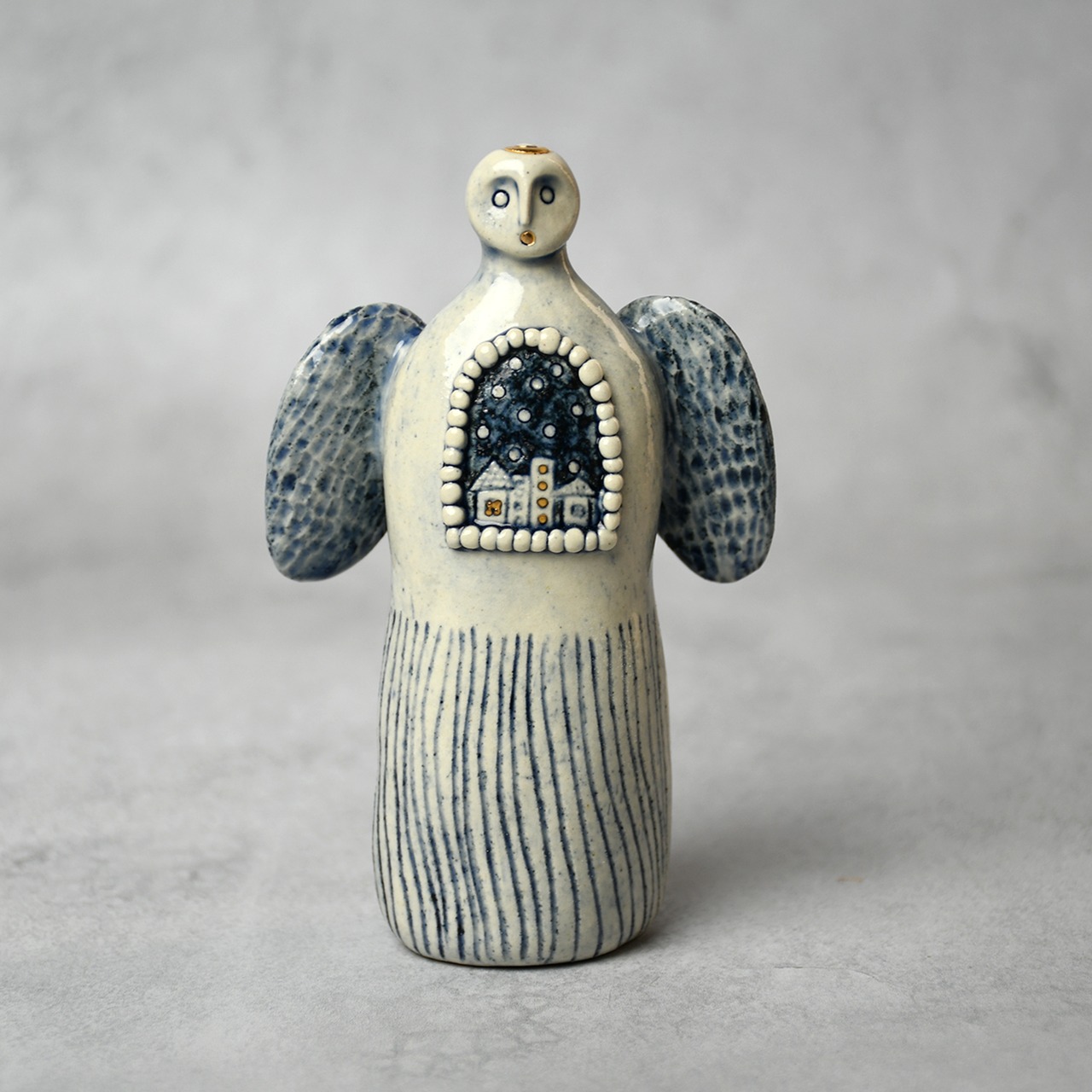 小さな命を祈って、こねこね手を動かしているうちに生まれてきた陶の天使。いつのまにか胸に窓がついたり、お花が咲いたり、しっぽが生えたり...不思議な姿に変化してきました。お守りとしてお部屋の片隅に居させてもらえたらいいな。みなさまに幸せを運びますように。