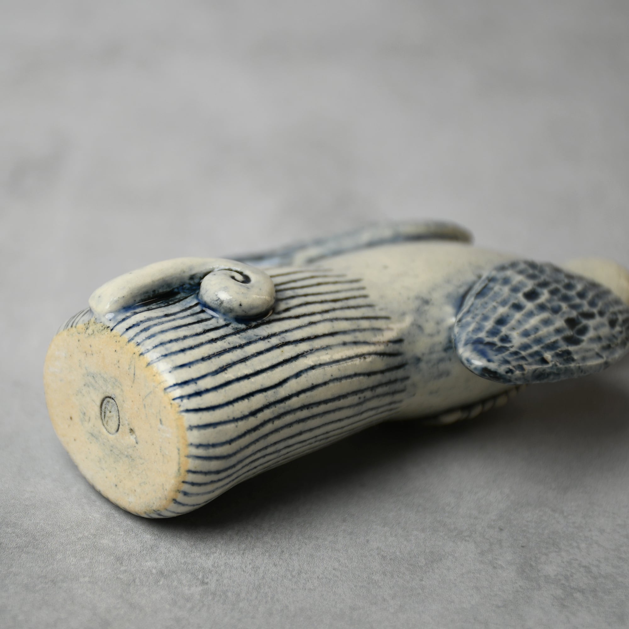・お顔や模様は彫りで表現しており、手に取ると凹凸を感じられます。落ち着いた色調の呉須(ごす)のブルーに、ピカピカの金彩を加えています。