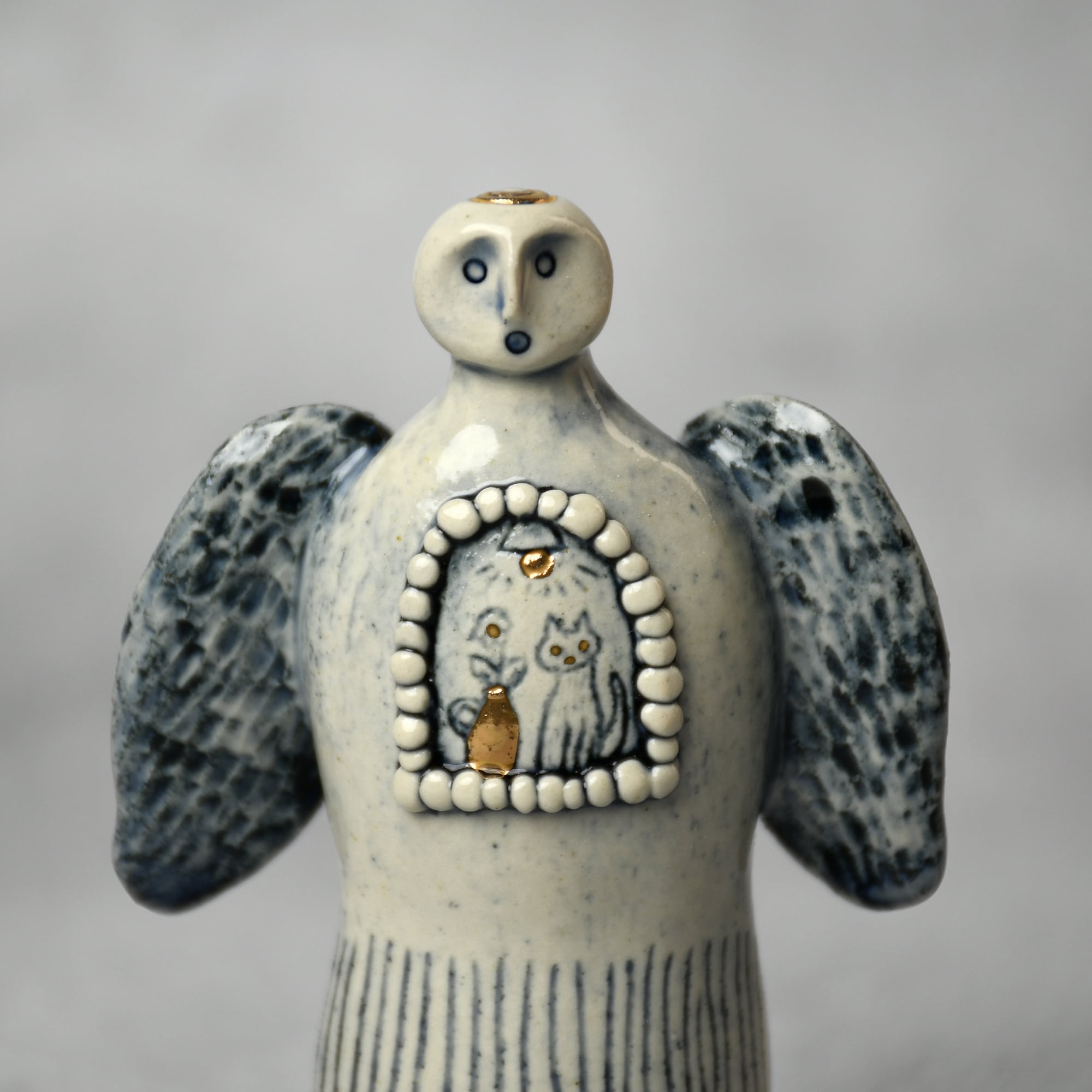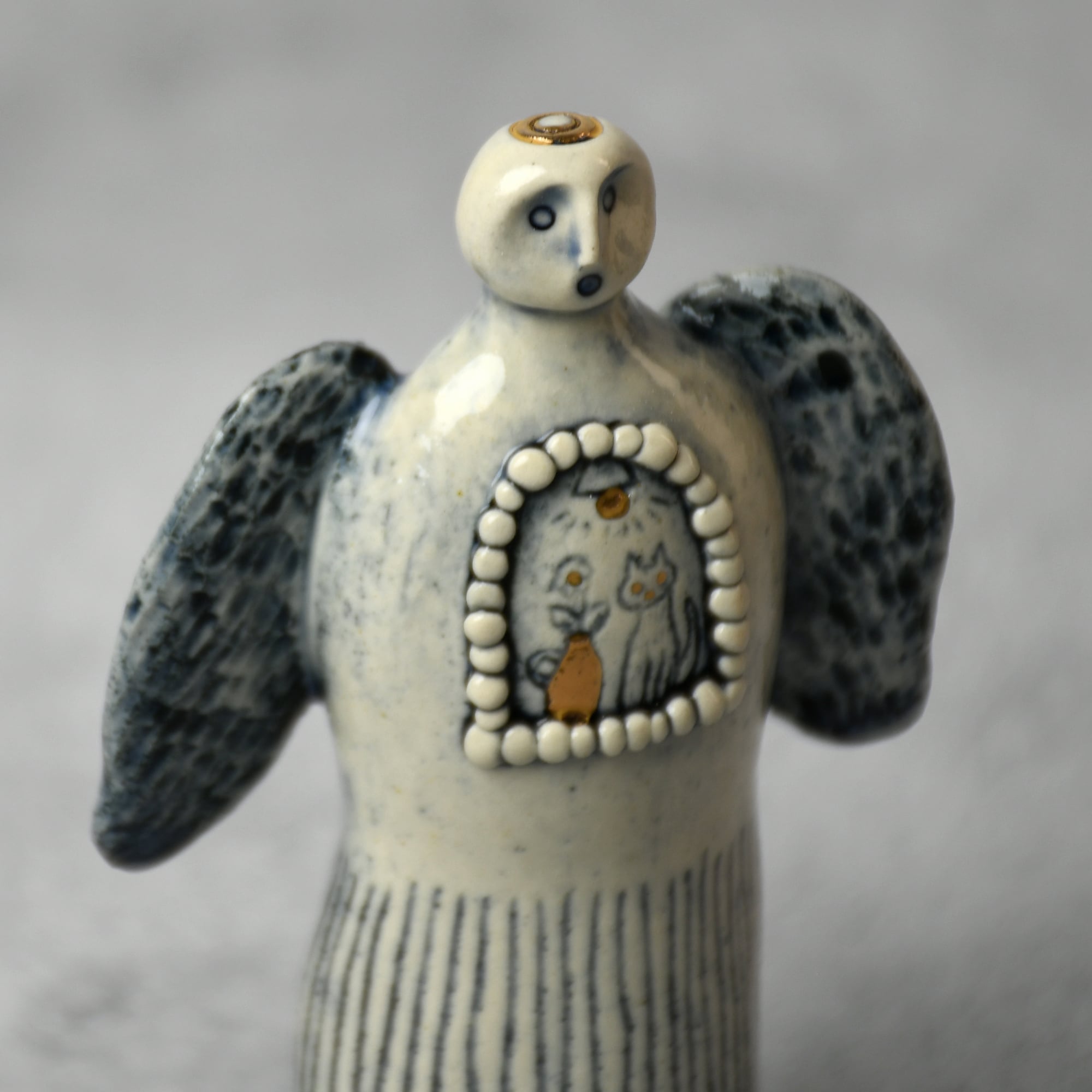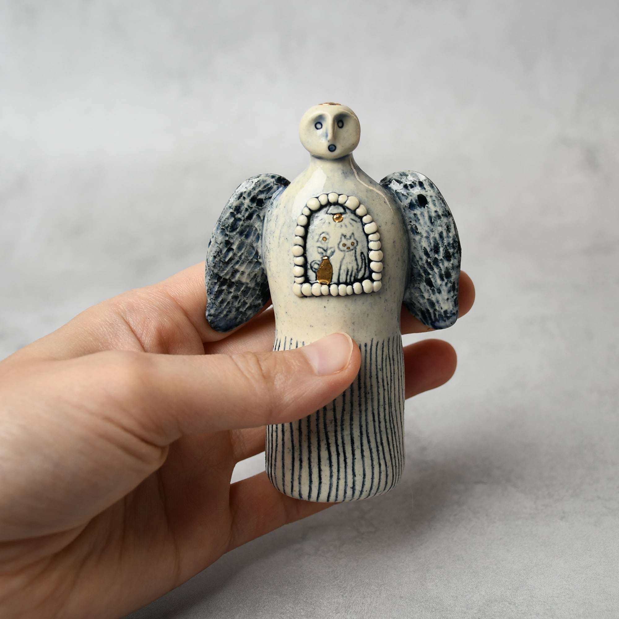 小さな命を祈って、こねこね手を動かしているうちに生まれてきた陶の天使。いつのまにか胸に窓がついたり、お花が咲いたり、しっぽが生えたり...不思議な姿に変化してきました。お守りとしてお部屋の片隅に居させてもらえたらいいな。みなさまに幸せを運びますように。